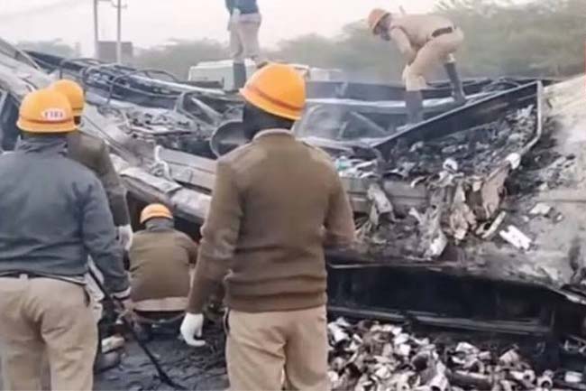 బెంగళూరు,డిసెంబర్ 25: కర్నాటకలో ఘోర ప్రమాదం చోటుచేసుకుంది. ఓ ప్రైవేట్ ట్రావెల్స్ బస్సును కంటైనర్ లారీ ఢీకొట్టడంతో బస్సులో మంటలు చెలరేగి 17మంది సజీవ దహనమయ్యారు. మరో 13మంది గాయపడ్డారు. కంటెయినర్ లారీ డివైడర్ను దాటి ఎదురుగా వస్తున్న బెంగళూరు నుంచి గోకర్ణ వెళ్తున్న సీబర్డ్ ప్రైవేట్ ట్రావెల్స్ బస్సును ఢీకొట్టడంతో బస్సులో మంటలు చెలరేగాయి. చిత్రదుర్గ జిల్లాలోని జాతీయ రహదారి`48పై గోర్లత్తు క్రాస్ వద్ద గురువారం వేకువజామున 2.30 గంటల సమయంలో ఈ ఘటన చోటుచేసుకుంది. ప్రమాద సమయంలో బస్సులో 32మంది ప్రయాణికులు ఉన్నారు. చిత్రదుర్గ, తుమకూరు జిల్లాల పరిధిలోని అధికార యంత్రాంగం ఘటనాస్థలికి చేరుకుని సహాయక చర్యలు చేపట్టింది. ప్రమాదానికి అతివేగం, పొగమంచు కారణమని భావిస్తున్నారు. బస్సుతోపాటు లారీకి కూడా మంటలు వ్యాపించాయి. ప్రమాదం జరిగిన వెంటనే బస్సు డ్రైవర్, కో డ్రైవర్ అందులోంచి దూకి తప్పించుకున్నారు. మరికొందరు ప్రయాణికులు అద్దాలను పగులగొట్టి ప్రాణాలు కాపాడుకున్నారు. వారిలో గగన, రక్షిత అనే యువతులు ఉన్నారు. తమ స్నేహితురాలు రష్మి కనిపించడం లేదని వారు కన్నీరుమున్నీరయ్యారు. ప్రయాణికుల్లో కొంతమందికి గాయాలు కావడంతో వారిని సిరా, హిరాయూరు హాస్పిటల్స్కు తరలించారు. ప్రయాణికుల్లో కొందరి పేర్లను అధికారులు గుర్తించారు. ఆ వివరాల ప్రకారం.. బస్సులో మంజునాథ్, సంధ్య, శశాంక్, దిలీప్, ప్రీతీశ్వరన్, వి.బిందు, కె.కవిత, అనిరుధ్ బెనర్జీ, అమృత, కల్పన, ప్రజాపతి, ఎం.శశికాంత్, విజయ్ భండారీ, నవ్య, అభిషేక్, హెచ్.కిరణ్పాల్, ఎం.కీర్తన్ ఉన్నట్లు తెలుస్తోంది. ఈ ప్రమాదంపై రాష్ట్రపతి ద్రౌపదీ ముర్ము, ప్రధానమంత్రి నరేంద్రమోదీ దిగ్భార్రతి వ్యక్తం చేశారు. మృతుల కుటుంబాలకు ప్రగాఢ సానుభూతి ప్రకటించారు. క్షతగాత్రులు త్వరగా కోలుకోవాలని ఆకాంక్షించారు. పీఎం రిలీఫ్ ఫండ్ కింద మృతుల కుటుంబాలకు రూ.2లక్షలు, క్షతగాత్రులకు రూ.50వేల చొప్పున నష్టపరిహారం అందించనున్నట్లు ప్రధానమంత్రి కార్యాలయం ప్రకటించింది.