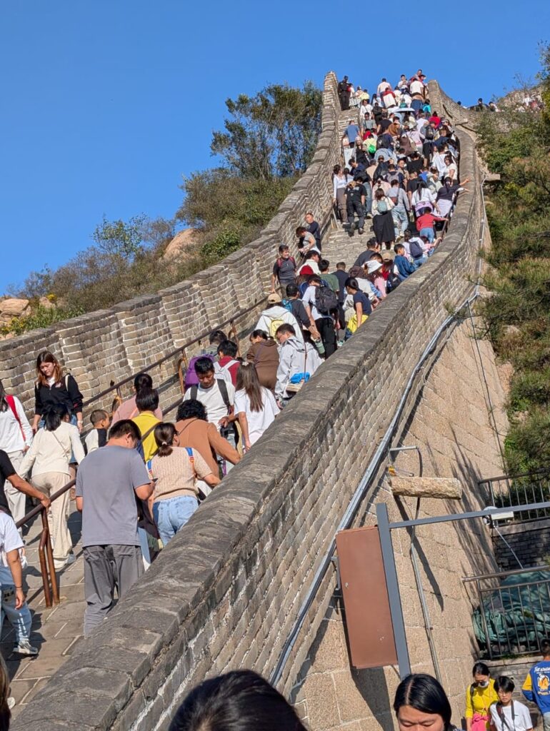 చైనా వాల్ సందర్శనకు నాలుగు మార్గాలున్నాయిట. మేము రోప్ వే మార్గంలో వెళ్ళాం. అక్కడి నుంచి నలుగురం మాత్రమే మెట్లగుండా మూడు నాలుగు కిలోమీటర్ల వరకు పైకి వెళ్ళాం. మెట్లు కొన్ని చోట్ల ఎత్తుగా, కొన్ని చోట్ల ఓ మాదిరిగా ఉన్నాయి. పొడవు 21, 196కిలోమీటర్లు. క్రి.పూ. 5,6 శతాబ్దాల నుంచి దానిని పడ గొడుతూ మూడు దశలుగా నిర్మించినట్లు గైడ్ చెప్పాడు. చైనాను మంగోలియన్ ల దాడుల నుంచి రక్షించడానికి ప్రస్తుత నిర్మాణం మింగ్ రాజులు నిర్మించారు. గోడ మధ్యలో సుమారు 1200 వాచ్ టవర్లు మూడంతస్తులలో ఉన్నాయి. పొడవు 6, 508 కిలోమీటర్లు. ప్రపంచంలోని ఏడు వింతలలో ఏడవది. ప్రపంచంలోనే మానవులు నిర్మించిన అతి పొడుగైన కట్టడం. సుమారు నలభై వేలమంది ఈ నిర్మాణంలో భాగమయ్యారట.