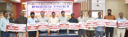 హైదరాబాద్, ప్రజాతంత్ర, జులై 7: ప్రభుత్వరంగ బ్యాంకులు, బీమా సంస్థల ప్రైవేటీకరణ చర్యలకు వ్యతిరేకంగా 9న జరిగే అఖిల భారత సమ్మెలో తాము కూడా భాగస్వామ్యమవుతున్నట్లు బ్యాంకులు, ఇన్స్యూరెన్స్ రంగాల యూనియన్ల జాయింట్ ఫోరం తెలిపింది. కేంద్ర ప్రభుత్వ ప్రజావ్యతిరేక విధానాలను నిరసిస్తూ నాలుగు లేబర్ కోడ్లు రద్దు చేయాలని డిమాండ్ చేస్తూ కేంద్ర కార్మిక సంఘాలు, ఉద్యోగ, ఉపాధ్యాయ సంఘాల ఐక్య వేదిక ఈనెల 9న నిర్వహించనున్న దేశవ్యాప్త సమ్మెలో రెండు తెలుగు రాష్ట్రాలలోని బ్యాంకులు, ఇన్స్యూరెన్స్ రంగాలకు చెందిన దాదాపు లక్షమంది ఉద్యోగులు పాల్గొననున్నట్లు తెలంగాణ, ఆంధ్రప్రదేశ్ రాష్ట్రాల జాయింట్ ఫోరం ఆఫ్ ఫైనాన్సియల్ సెక్టార్ యూనియన్స్ (జెఎఫ్ఎఫ్ఎస్యు) ప్రకటించింది. కేంద్రంలో బిజేపి నేతృత్వంలోని ఎన్డీయే ప్రభుత్వం అవలంబిస్తున్న ఉద్యోగ, కార్మిక, ప్రజావ్యతిరేక విధానాలు ప్రభుత్వరంగ ఆర్ధిక సంస్థలైన బ్యాంకులు, ఇన్స్యూరెన్స్ రంగాలను కూడా ప్రభావితం చేస్తూ వాటి మనుగడకే ప్రమాదకరంగా తయారయ్యాయని, ఈ విధానాలను ప్రతిఘటిస్తామని జెఎఫ్ హెచ్చరించింది. హైదరాబాద్ కోఠిలోని ఎపిటిబిఇఎఫ్ రాష్ట్ర కార్యాలయంలో సోమవారం ఏర్పాటు చేసిన మీడియా సమావేశంలో బ్యాంకులు, ఇన్స్యూరెన్స్ సంస్థల ఉద్యోగులు, అధికారుల యూనియన్లతో కూడిన జెఎఫ్ఎఫ్ఎస్యు నాయకులు బి.ఎస్.రాంబాబు, సమద్ ఖాన్ (ఎపిటిబిఇఎఫ్ఎఐబిఇఎ), ఫణికుమార్ (ఎఐబిఓఎ), టివిఎన్ఎస్.రవీంద్రనాథ్ (ఎస్ఎన్జెడ్ఐఇఎఫ్), టి.సతీష్ (ఎన్.జి.తిరుపతయ్య (ఎల్ఐసిఇయు), కె.గంగాధర్ నాయుడు, ఎం.హరీష్ (బిఇఎఫ్ఐ), ఎస్.గుణశేఖర్, ఎల్.మద్దిలేటి (ఐసిఇయు), యూనియన్ల నాయకులు డి.గిరిధర్, ఆర్.శ్రీనివాస్, మహ్మద్ జావెద్ తదితరులు మాట్లాడారు. ఎఐబిఇఎ జాతీయ కార్యదర్శి బి.ఎస్.రాంబాబు మాట్లాడుతూ బ్యాంకింగ్, ఇన్సూరెన్స్ సంస్థల ప్రైవేటీకరణకు కేంద్రం యత్నిస్తున్నదని, ఇప్పటికైనా ఈ విధానాలను విరమించుకోనట్లయితే పార్లమెంట్లో బిల్లు పెట్టిన రోజే దేశవ్యాప్తంగా బ్యాంకింగ్, ఇన్సూరెన్స్ సంస్థలలో నిరవధిక సమ్మె చేపడతామని హెచ్చరించారు. ఇప్పటికే బ్యాంకింగ్, ఇన్సురెన్స్ సంస్థలలో తగిన సిబ్బంది లేకపోవడం వల్ల పనిభారంతో ఉన్న సిబ్బంది అధికంగా పనిచేస్తూ సతమతమౌతుంటే, కొత్తగా పని గంటలను పెంచాలనే ప్రతిపాదనను తీసుకురావడం గర్హనీయమన్నారు. దేశ ఆర్థిక వ్యవస్థ రక్షణ, ఉద్యోగులు, కార్మికులు, ప్రజల ప్రయోజనాల కోసం ప్రభుత్వ రంగ బ్యాంకింగ్, ఇన్సురెన్స్ సంస్థలను కాపాడాకోవాల్సిన అవసరం ఉందని, అందు కోసం ఈ నెల 9న జరిగే సమ్మెకు ప్రజలు సహకరించాలని ఆయన కోరారు. రవీంద్రనాథ్ మాట్లాడుతూ ప్రభుత్వ రంగాన్ని నిర్వీర్యం చేయడంలో భాగంగా ప్రభుత్వరంగ ఇన్సూరెన్స్ వ్యవస్థపై కేంద్ర ప్రభుత్వం తీవ్రంగ