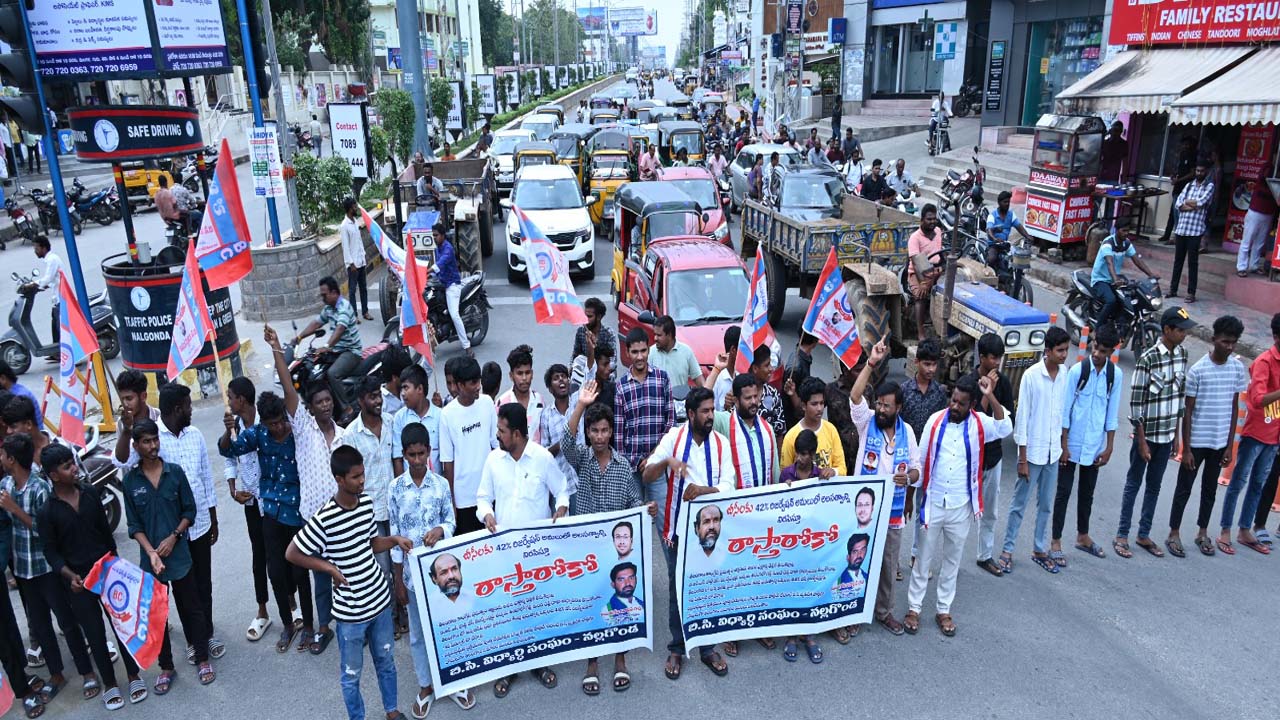 నల్గొండ, ప్రజాతంత్ర, జూలై 19: తెలంగాణ లో విద్యా ఉద్యోగ,స్థానిక సంస్థలలో బి.సీ ల 42% రిజర్వేషన్ అమలు జరగకుండా బిజెపి కుట్ర పన్నుతుందని తెలంగాణ విద్యావంతుల వేదిక జిల్లా అధ్యక్షులు పందుల సైదులు,బి.సి విద్యార్థి సంఘం జిల్లా అధ్యక్షులు అయితగోని జనార్దన్ గౌడ్ ఆరోపించారు. బిసి రిజర్వేషన్ అమలులో వివిధ పార్టీల అలసత్వాన్ని నిరసిస్తూ బీసీ విద్యార్థి సంఘం జిల్లా కమిటీ ఆధ్వర్యంలో శనివారం నల్లగొండ పట్టణంలోని పెద్ద గడియారం చౌరస్తాలో రాస్తారోకో కార్యక్రమం నిర్వహించారు. ఈ సందర్భంగా పందుల సైదులు మాట్లాడుతూ బీపీ మండల్ దగ్గర నుంచి మొదలు పెడితే నేటి వరకు బిజెపిది బీసీల పట్ల వ్యతిరేక వైఖరేనన్నారు.బీజేపీకి బీసీలపై చిత్తశుద్ధి ఉంటే డిల్లీలో బీసీ రిజర్వేషన్ల బిల్లును ఆమోదించాలన్నారు. బీజేపీ నేతలు బీసీలను తప్పుదోవ పట్టించడం మానుకోవా లన్నారు. బీసీ రిజర్వేషన్లు ముస్లింలు ఉన్నందునే ఆమోదం తెలపలేదనడం వారి అవివేకానికి నిదర్శనం అన్నారు.జాతీయ స్థాయిలో ముస్లిం లకు బీజేపీ రిజర్వేషన్లు కల్పిస్తున్నది వాస్తవం కాదా? అని ప్రశ్నించారు. బిజెపి పాలిత రాష్ట్రాలలో ముస్లింలకు రిజర్వేషన్లు అమలు చేస్తుంది వాస్తవం. ఏపీలో ఇండియా కూటమి ప్రభుత్వం ముస్లింలకు నాలుగు శాతం రిజర్వేషన్లు అమలు చేస్తున్నది నిజమన్నారు. బీజేపీ తెలంగాణ రాష్ట్ర అధ్యక్షుడు రాంచందర్ రావు, కేంద్రమంత్రి బండి సంజయ్ లు బీసీ రిజర్వేషన్లపై అవగాహన లేకుండా మాట్లాడు తున్నారని,42శాతం బీసీ రిజర్వే షన్లలోనే 10 శాతం ముస్లింలకు రిజర్వేషన్లు అమలు చేస్తున్నారని ఆరోపించడం దారుణం అన్నారు. తెలంగాణ ప్రభుత్వం బీసీలకు విద్య, ఉద్యోగ, రాజకీయ రంగాల్లో 42 శాతం రిజర్వేషన్లను పెంచుతూ..తెలంగాణ అసెంబ్లీలో బిల్లు ఆమోదించి..గవర్నర్ ద్వారా కేంద్ర ప్రభుత్వానికి పంపి మూడు నెలలు పూర్తి అయినప్పటికీ నేటి వరకు ఆ రిజర్వేషన్ల బిల్లుకు ఆమోదం తెలప కుండా బీసీలకు అన్యాయం చేస్తున్నదన్నారు. బీసీ రిజర్వేషన్లను తొమ్మిదవ షెడ్యూల్ లో చేర్చాలని కేంద్ర ప్రభుత్వాన్ని బీఆర్ఎస్ నేతలు డిమాండ్ చేయడం లేదంటే బీసీ రిజర్వేషన్ల విషయంలో బీజేపీ, బీఆర్ఎస్ ఒక్కటేనని బీసీలు భావిస్తున్నారన్నారు.