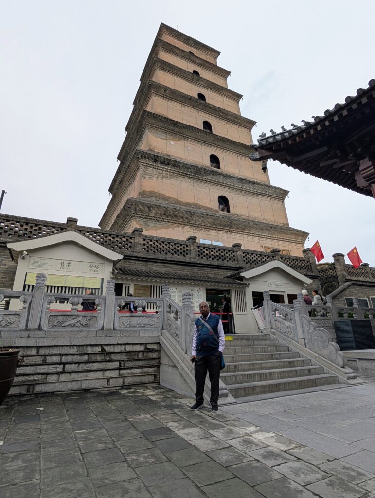 “జెయింట్ వైల్డ్ పగోడా చూడడానికి వెళ్ళాము. దీనిని బిగ్ వైల్డ్ పగోడా అని కూడా పిలుస్తారు. దీనిని క్రీ పూ 652 లో టాంగ్ వంశీయులు నిర్మించారు. జువాన్ జాంగ్ అనే బౌద్ధ సన్యాసి భారత దేశం నుండి తీసుక వచ్చిన బుద్ధుని అవశేషాలను, గ్రంధాలను సంరక్షించడానికి ఈ పగోడా నిర్మాణం జరిగింది.”