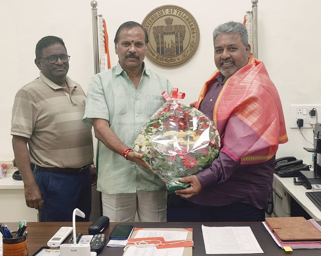 హైద్రాబాద్, ప్రజాతంత్ర, డిసెంబర్ 5: ఇండస్ట్రీస్ డిపార్టుమెంట్ అడిషనల్ డైరెక్టర్ గా బాధ్యతలు స్వీకరించిన శ్రీనివాస్ నాయక్ ను టీజీవో నాయకులు శుక్రవారం మర్యాదపూర్వకంగా కలిసి శుభాకాంక్షలు తెలిపారు. టీజీవో హైదరాబాద్ జిల్లా అధ్యక్షుడు ఎం.బి.కృష్ణ యాదవ్ తదితరులు బొకే అందించారు. ఈ సందర్భంగా శ్రీనివాస్ నాయక్ మాట్లాడుతూ అధికారులు, ఉద్యోగుల సహకారంతో ముందుకెళ్తానని తెలియజేశారు. ఏమైనా సమస్యలు ఉంటే తన దృష్టికి తీసుకురావాలని సూచించారు. అధికారులు సమన్వయంతో పనిచేసి పారిశ్రామిక అభివృద్ధికి తోడ్పాటు అందించాలని ఆయన కోరారు.