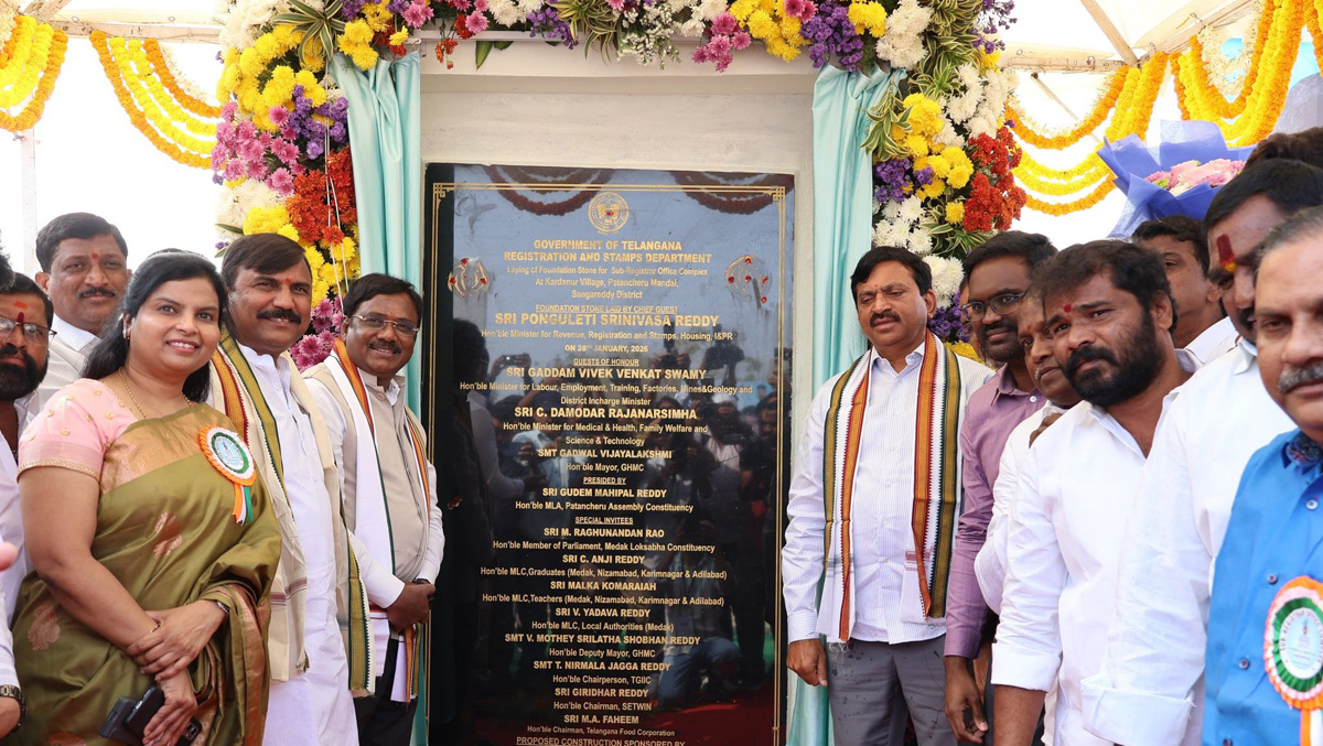మంత్రి గడ్డం వివేక్ వెంకటస్వామి మాట్లాడుతూ రాష్ట్రానికి పటాన్చెరు పారిశ్రామిక హబ్గా మారిందని చెప్పారు. దేశాన్ని ప్రపంచంలో మూడో స్థానానికి తీసుకురావాలంటే భూ సమస్యలు లేని రాష్ట్రంగా తెలంగాణను తీర్చిదిద్దాల్సిన అవసరం ఉందన్నారు. గత ప్రభుత్వం తీసుకువచ్చిన ధరణి పోర్టల్ వల్ల ప్రజలకు అనేక భూ సమస్యలు వచ్చాయని, దాని కారణంగా ప్రజలు ఆందోళనలు చేశారని గుర్తు చేశారు. భూభారతి చట్టం ద్వారా ఆ సమస్యలకు పరిష్కారం లభిస్తుందని అన్నారు. రిజిస్ట్రేషన్లు, స్టాంప్స్ శాఖ కమిషనర్ రాజీవగాంధీ హనుమంతు మాట్లాడుతూ.. రాష్ట్ర రిజిస్ట్రేషన్ శాఖ ద్వారా రాష్ట్ర ప్రభుత్వానికి ప్రతి సంవత్సరం సుమారు రూ.14,500 కోట్ల ఆదాయం సమకూరుతోందని తెలిపారు. రాష్ట్రంలో ప్రస్తుతం 144 సబ్ రిజిస్టర్ కార్యాలయాలు పనిచేస్తున్నాయని, ఓఆర్ఆర్ పరిధిలోని మరియు వెలుపల ఉన్న కార్యాలయాలను క్లస్టర్లుగా ఏర్పాటు చేసి సమీకృత భవనాలు నిర్మించాలనే నిర్ణయం ప్రభుత్వం తీసుకుందని చెప్పారు. పటాన్చెరు పరిధిలో సబ్ రిజిస్ట్రేషన్ కార్యాలయం మంజూరుతో పాటు సమీకృత సబ్ రిజిస్టర్ కార్యాలయ భవన నిర్మాణం చేపట్టినట్లు వివరించారు. కార్యక్రమంలో ఎమ్మెల్సీ చిన్నమైల్ అంజిరెడ్డి, టీజీఐఐసీ చైర్పెర్సన్ నిర్మల జయప్రకాశ్ రెడ్డి, రాష్ట్ర ఫుడ్ కార్పొరేషన్ చైర్మన్ ఫయీమ్, జిల్లా రిజిస్ట్రార్, సబ్ రిజిస్టార్లు, ఆర్డీఓ, జిల్లా సర్వే ల్యాండ్ రికార్డ్స్ అధికారి, రాజ్ పుష్ప ఇంఫాస్ట్రక్చర్ ప్రైవేట్ లిమిటెడ్ ఎండి శ్రీనివాస్ రెడ్డి, రెవెన్యూ అధికారులు, సంబంధిత శాఖల అధికారులు, డాక్యుమెంట్ రైటర్లు, ప్రజాప్రతినిధులు, ప్రజలు, తదితరులు పాల్గొన్నారు.