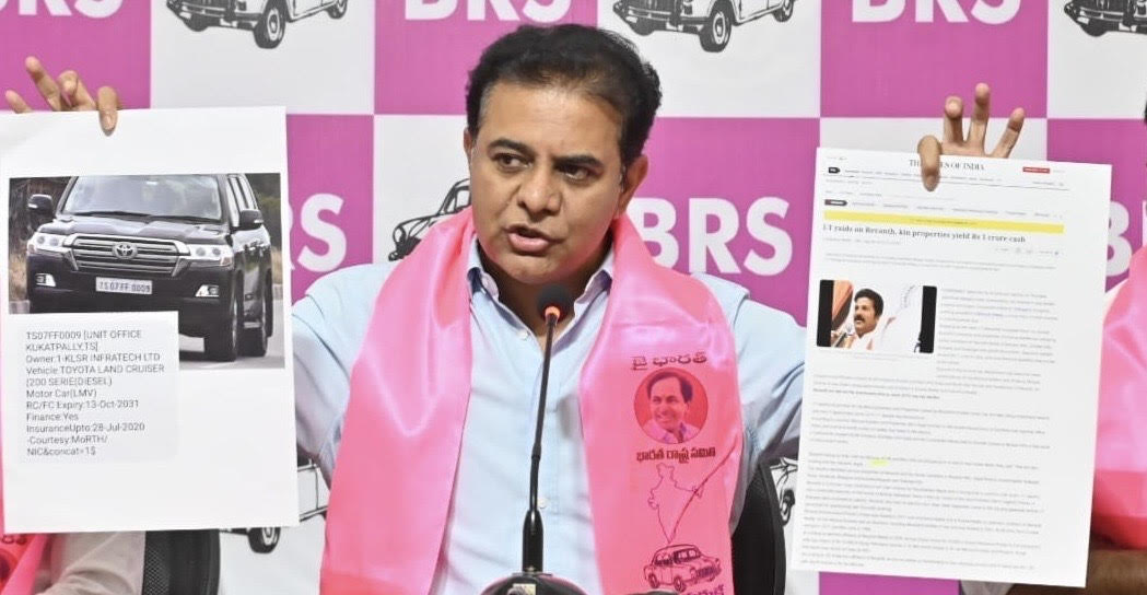 రెండేళ్ల కాలంలో అనేక కుంభకోణాలను ప్రధాన ప్రతిపక్షంగా బయటపెట్టిన విషయాన్ని కేటీఆర్ గుర్తు చేస్తూ ప్రతి అంశంలోనూ రేవంత్ రెడ్డి దాటవేత ధోరణితో వ్యవహరించారన్నారు. 2023 జులై 23న ఈ కంపెనీకి మరో కంపెనీ ఏఎస్ఎంఈటి మధ్య గొడవ జరిగిందని, వారిద్దరూ నేషనల్ కంపెనీ లా ట్రిబ్యునల్ను అప్రోచ్ అయ్యారని, ఆ తర్వాత కేసు నడుస్తున్నదని తెలిపారు. తర్వాత కెఎల్ఎస్ఆర్ అక్కడ కార్పొరేట్ ఇన్సాల్వెన్సీ రిజల్యూషన్ పిటిషన్ వేసి తాము దివాళా తీసిన విషయాన్ని స్పష్టంగా చెప్పిందని, దాంతో ఈ కంపెనీలో ఆర్థిక లావాదేవీలను ఎన్.సి.ఎల్.టి నిషేధించిందని కేటీఆర్ గుర్తు చేశారు. ఈ కేసు విషయంలో ఎన్.సి.ఎల్.టి, ఒక ఉన్నత న్యాయస్థానానికి చెందిన జడ్జ్ ద్వారా జస్టిస్ శరత్ కుమార్ పైన ఒత్తిడి తీసుకురావడానికి ప్రయత్నం చేస్తే ఆయన ఆ విషయాన్ని బయటపెట్టి ఆ కేసు నుంచి తప్పుకున్నారని కేటీఆర్ తెలిపారు. అయితే ఎన్సిఎల్ టిలోనూ జడ్జిల ద్వారా కంపెనీకి సానుకూలంగా తీర్పు వచ్చేలా నిలబడిన వ్యక్తి ముమ్మాటికీ రేవంత్ రెడ్డి అని కేటీఆర్ ఆరోపించారు. కెఎల్ఎస్ఆర్ లో రేవంత్ అనేక పెట్టుబడులు పెట్టాడని, అందుకే రేవంత్ రెడ్డి బావమరిదికి సంబంధించిన సాయి మౌర్య అనే కంపెనీతో లావాదేవీలు నడిపిందన్నారు. కెఎల్ఎస్ఆర్ ద్వారా సాయి మౌర్య అనే కంపెనీలోకి డబ్బులు పంపి దాని నుంచి భారీగా భూములు కొనుగోలు చేసే పని చేసిందని కేటీఆర్ తెలిపారు. 2018లో ఈడీ కూడా ఈ కంపెనీ మీద దాడి చేసి అనేక ఆధారాలు బయటపెట్టిందన్నారు. ఇంత దుర్మార్గమైన, నీచమైన చరిత్ర ఉన్న కెఎల్ఎస్ఆర్ కి, దివాళా తీసిన కెఎల్ఎస్ఆర్ కంపెనీకి రేవంత్ రెడ్డి హయాంలో రూ.6,000 కోట్ల ప్రాజెక్టులు వచ్చాయని, అమృత్ స్కీమ్, జల్ జీవన్ మిషన్, యంగ్ ఇండియా రెసిడెన్షియల్ స్కూల్స్, తెలంగాణ సాగునీటి ప్రాజెక్ట్ పనులు, రహదారుల పనులను ఈ కంపెనీ ఎలా పొందిందో ముఖ్యమంత్రి సమాధానం చెప్పాలన్నారు. ముఖ్యమంత్రి ఆధ్వర్యంలోని పురపాలక శాఖతోపాటు ముఖ్యమంత్రి నియోజకవర్గంలో ఈ కంపెనీ భారీగా పనులు దక్కించుకున్నదన్నారు. అయితే 2023 నుంచే దివాళా తీసిన కంపెనీకి 2024-26 సంవత్సరాల్లో ఏ విధంగా ప్రభుత్వం కాంట్రాక్టులు ఇచ్చిందన్న విషయాన్ని స్పష్టం చేయాలని డిమాండ్ చేశారు.