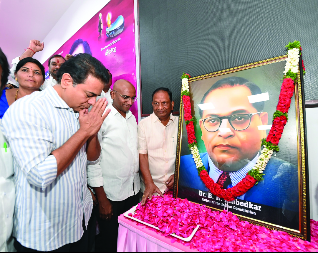 హైదరాబాద్, ప్రజాతంత్ర, ఏప్రిల్ 14 : కొత్త రాష్ట్రాల ఏర్పాటుకు డాక్టర్ బీఆర్ అంబేడ్కర్ ఆలోచనలే కారణమని బీఆర్ఎస్ వర్కింగ్ ప్రెసిడెంట్ కేటీఆర్ అన్నారు. ఆధునిక భారతావనికి పునాదులు వేశారని తెలిపారు. బాబాసాహెబ్ ఆలోచన, ముందు చూపు చాలా గొప్పదని వెల్లడించారు. ఆయన వల్లనే తెలంగాణ కల సాకారమయ్యిందని అన్నారు. దేశంలో అందరూ బాగుండాలన్నదే అంబేడ్కర్ ఆలోచన అని చెప్పారు. అంబేడ్కర్ ఆలోచనను కేసీఆర్ ఆచరణలో పెట్టారన్నారు. దళితబంధు లాంటి పథకాన్ని అమలు చేసిన దమ్మున్న నాయకుడు కేసీఆర్ అన్నారు. అబద్ధపు ప్రచారంతో ప్రజలను కాంగ్రెస్ పార్టీ మోసం చేస్తున్నదని, దళితులకు అంబేద్కర్ అభయహస్తం ఇంకెప్పుడు ఇస్తారని ప్రశ్నించారు. రూ.12 లక్షల కాదుకదా.. 12 రూపాయలు కూడా ఇవ్వరని విమర్శించారు. హైదరాబాద్ తెలంగాణ భవన్లో బీఆర్ అంబేడ్కర్ జయంతి వేడుకలను ఘనంగా నిర్వహించారు.