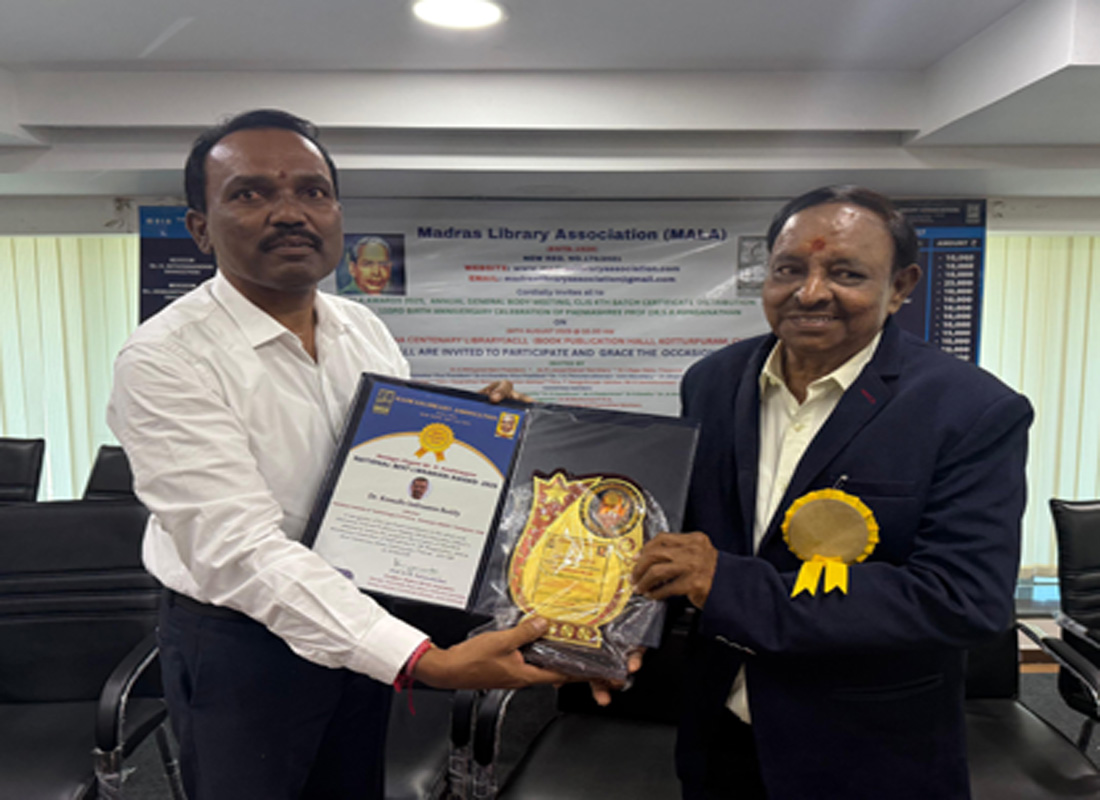 వరంగల్, ప్రజాతంత్ర, ఆగస్ట్ 25 : కాకతీయ ఇన్స్టిట్యూట్ ఆఫ్ టెక్నాలజీ అండ్ సైన్స్ (కిట్స్) వరంగల్లో గ్రంథాలయ అధికారిగా సేవలందిస్తున్న డాక్టర్ కోమల్ల ఇంద్రసేనారెడ్డి జాతీయ ఉత్తమ గ్రంథాలయాధికారి అవార్డును అందుకున్నారు. మద్రాస్ లైబ్రరీ అసోసియేషన్ చెన్నై అధ్యక్షుడు ప్రొఫెసర్ కె.నిత్యానందం చేతుల మీదుగా చెన్నై అన్నా శతాబ్ది గ్రంథాలయంలో ఆదివారం జరిగిన ఎస్సార్ రంగనాథన్ 133వ జయంతి సందర్భంగా ఈ అవార్డును అందుకున్నారు. డాక్టర్ ఇంద్రసేనారెడ్డి రెండు దశాబ్దాలుగా విద్యా సంస్థలలో ఆధునిక గ్రంథాలయాల అభివృద్ధి, డిజిటల్ లైబ్రరీల స్థాపన, విద్యార్థులకు నూతన సాంకేతిక పద్ధతుల ద్వారా విజ్ఞాన సముపార్జనలో మార్గదర్శకత్వం వహిస్తున్నారు. కిట్స్లో ఆయన ప్రస్తుత సేవలతో పాటు, దేశవ్యాప్తంగా లైబ్రరీ ప్రొఫెషనల్ నెట్వర్క్లలోనూ చురుకైన భాగస్వామిగా ఉన్నారు. పరిశోధన, అధ్యయనాలపై ప్రత్యేక దృష్టి సారిస్తూ అనేక జాతీయ, అంతర్జాతీయ సదస్సుల్లో రచనలు సమర్పించిన డాక్టర్ ఇంద్రసేనారెడ్డి రెడ్డి విద్యా రంగానికి ఎనలేని సేవలందించారు. ఈ సందర్భంగా ఇంద్రసేనారెడ్డి మాట్లాడుతూ తాను పనిచేస్తున్న కిట్స్ వరంగల్ యాజమాన్యానికి కృతజ్ఞతలు తెలిపారు. పాతికేళ్ల ప్రయాణంలో సాంప్రదాయ గ్రంథాలయాన్ని డిజిటల్ లైబ్రరీగా మార్చే ప్రయత్నాలు చేశామని, విద్యార్థులు, అధ్యాపకులు, పరిశోధకులకు ఉపయోగపడేలా సమాచార వనరులను సమర్థవంతంగా అందించే విధానాలను అభివృద్ధి చేశామని చెప్పారు. ఇవన్నీ ఒంటరిగా సాధ్యం కావని, ఇది తమ బృందం కృషికి, సంస్థ మద్దతుకు ఫలితమని తెలిపారు. ఈ పురస్కారం తనకు మరింత బాధ్యతను పెంచిందని తెలిపారు. భవిష్యత్తులో కూడా విద్యారంగంలో విజ్ఞానం పంచే మార్గాల్లో కొనసాగాలని, గ్రంథాలయాన్ని కేవలం పుస్తకాల గదిగా కాకుండా ఒక జీవితమైన విజ్ఞాన కేంద్రంగా తీర్చిదిద్దాలన్న సంకల్పంతో కొనసాగుతామని తెలిపారు. రాజ్యసభ మాజీ సభ్యుడు, కిట్స్ వరంగల్ చైర్మన్ కెప్టెన్ వి.లక్ష్మీకాంతరావు, కోశాధికారి పి.నారాయణరెడ్డి, హుస్నాబాద్ నియోజకవర్గ మాజీ ఎమ్మెల్యే, కిట్స్ అడిషనల్ సెక్రెటరీ వి.సతీష్ కుమార్, ప్రిన్సిపాల్ కె.అశోక రెడ్డి, రిజిస్ట్రార్ ఎం.కోమల్ రెడ్డి, డీన్ అకడమిక్ వేణుమాధవ్, అడ్మినిస్ట్రేటివ్ ఆఫీసర్ పి.రమేష్ రెడ్డి, లైబ్రరీ కమిటీ చైర్మన్ ప్రొఫెసర్ బి.రమాదేవి, గ్రంథాలయ సిబ్బంది, అధ్యాపకవర్గం, విద్యార్థులు, సిబ్బంది ఇంద్రసేనారెడ్డిని అభినందించారు. ఆయన గొప్ప గౌరవం పొందడం వల్ల గ్రంధాలయ నిర్వహణలో తమ కాలేజీకి జాతీయస్థాయిలో గుర్తింపు లభించిందన్నారు.