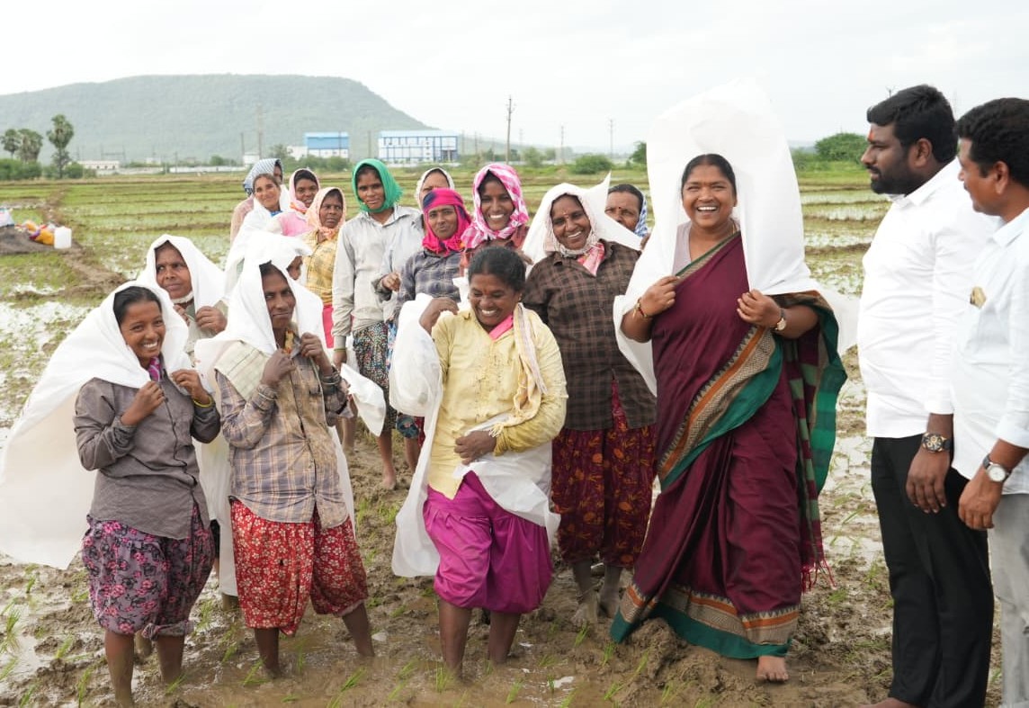 సమీక్షకు వచ్చిన మంత్రి సీతక్క అ ప్రాంతంలో వరి నాట్లు వేసే కూలీలను ఆప్యాయంగా పలకరించారు. బురద పొలంలోకి దిగి కూలీల యోగ క్షేమాలను అడిగి తెలుసుకున్నారు. వర్షం నుంచి రక్షణకై ప్రత్యేకంగా తయారు చేసిన కవర్లను కూలీలకు మంత్రి పంపిణీ చేశారు. స్వయంగా కవర్లను కూలీలకు తొడిగి, వారి సంక్షేమం, ఆరోగ్యం పట్ల తన నిబద్ధతను చాటుకున్నారు. రేషన్ కార్డులు, ఇందిరమ్మ ఇండ్లు, ఇతర సంక్షేమ పథకాలు ఎలా అందుతున్నాయని వారిని అడిగి తెలుసుకున్నారు. రెండు మూడు రోజుల్లో అర్హులందరికీ రేషన్ కార్డులు అందజేస్తామని హామీ ఇచ్చారు. మంత్రి స్వయంగా తమ వద్దకు వచ్చి పలకరించడంతో కూలీల మోముల్లో దరహాసం వెల్లివిరిసింది.