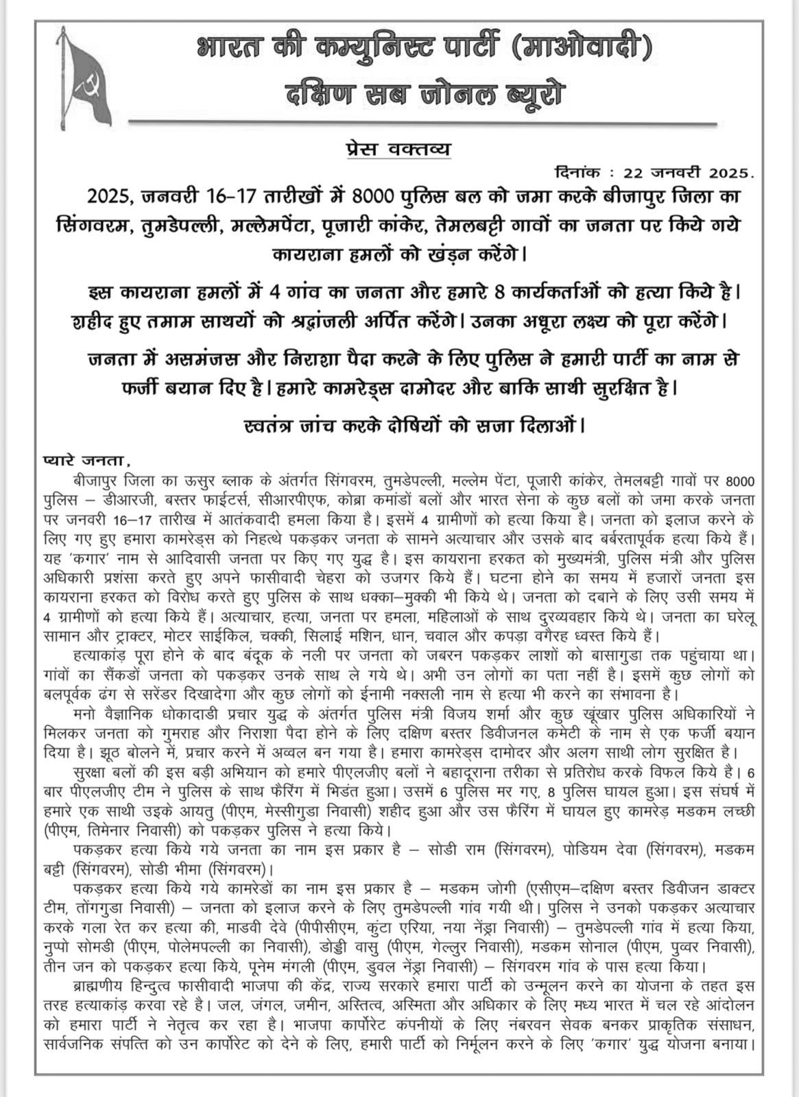 ఈనెల 16న జరిగిన ఎన్కౌంటర్లో 8 వేల మంది పోలీస్ బలగాలను బీజాపూర్ జిల్లాలోని సింగవరం, తుండెపల్లి, మల్లంపేట, కూజారి కాంకేర్ గ్రామాల ప్రజలపై జరిగిన పిరికిపంద దాడులను తిప్పికొడుతున్నట్లు లేఖలో పేర్కొన్నారు. ఈ ఎన్కౌంటర్పై స్వతంత్ర విచారణ జరిపి దోషులను కఠినంగా శిక్షించాలని లేఖ ద్వారా ప్రభుత్వాన్ని కోరారు. ప్రజలకు వైద్యం చేసేందుకు వెళ్లిన సహచరులను నిరాయుధులుగా పట్టుకొని ప్రజల ముందు చిత్రహింసలకు గురిచేసి దారుణ హత్య చేశారని లేఖలో పేర్కొన్నారు. ఈ హత్యలపై విచారణ జరిపించాలని లేఖ ద్వారా డిమాండ్ చేశారు.