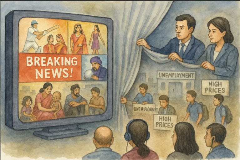 భారతీయ ప్రధాన మీడియా సంస్థలు చాలా జాగ్రత్తగా, ఉద్దేశపూర్వకంగా ప్రజల దృష్టిని అసలైన సమస్యల నుండి అనవసర విషయాలవైపు మళ్లిస్తోంది. భారతదేశంలోని నెలకొన్నవి సామాజిక-ఆర్థిక సమస్యలే. 75 శాతం మందికంటే ఎక్కువ మంది ప్రజలు పేదరికంలో జీవించటం, భారీ స్థాయిలో నిరుద్యోగం, ఆహారం మరియు నిత్యావసర వస్తువుల ధరలు ఆకాశానికి ఎగబాకడం, సామాన్యులకి తగిన విద్య, వైద్య సేవలు లేకపోవడం, పిల్లలలో భయంకరమైన పోషకాహార లోపం (ప్రపంచ ఆకలి సూచిక ప్రకారం, భారతదేశంలో ప్రతి రెండో బిడ్డకు పోషకాహార లోపం ఉంది. గత కొన్ని సంవత్సరాల్లో ఈ పరిస్థితి మరింత దారుణంగా మారింది. మొత్తం 125 దేశాల్లో ఇండియా ర్యాంక్ 101 నుండి 107కి పడిపోయింది) మహిళలు, దళితులు, మైనారిటీలపై వివక్ష, పరువు హత్యలు, మతం ఆధారిత విద్వేషాలు… ఇలాంటి పాత కాలపు సామాజిక దురాచారాలు ఇంకా కొనసాగుతూనే ఉన్నాయి. ఈ సమస్యలపై ప్రధాన మీడియా సంస్థలు దృష్టి కేంద్రీకరించాల్సిన సమయంలో అందుకు భిన్నంగా ప్రజల దృష్టిని క్రికెట్, సినిమా నటుల ప్రైవేటు జీవితాలు, ఫ్యాషన్ షోలు, జ్యోతిష్యం, పాప్ సంగీతం, డిస్కో నృత్యాలు, రియాలిటీ షోల వంటి అనవసర, అసంబద్ధ విషయాల వైపు ప్రజల దృష్టిని మళ్ళిస్తుంది.