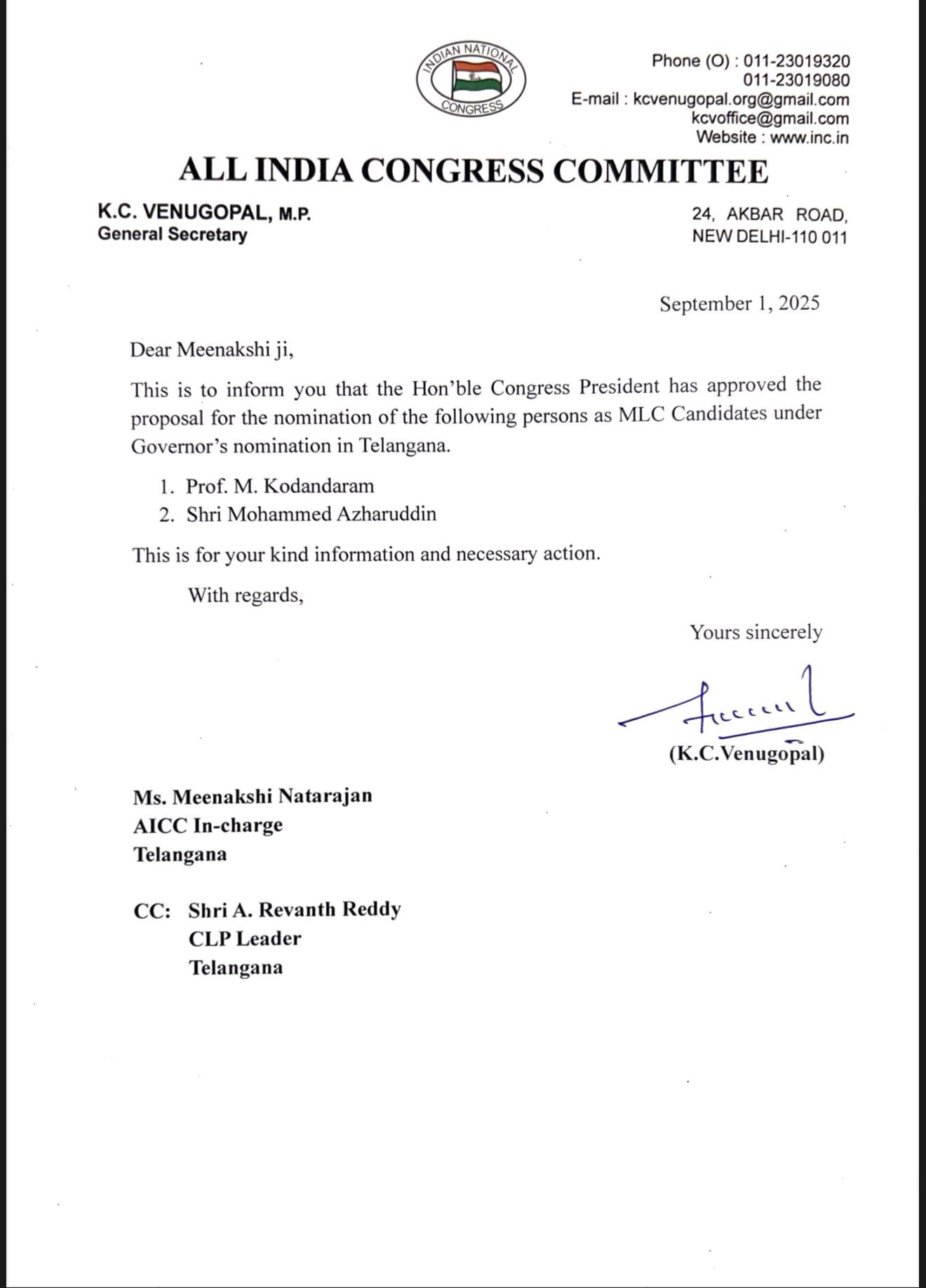 – సీఎం రేవంత్కు సమాచారమిచ్చిన కేసీ వేణుగోపాల్