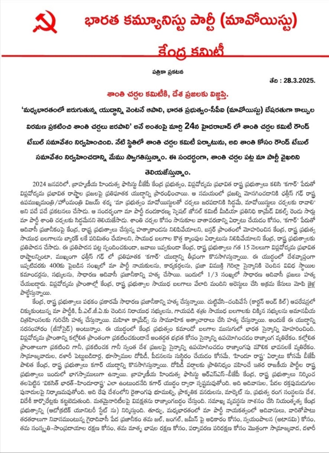 భద్రాచలం,ప్రజాతంత్ర,ఏప్రిల్ 02 : మావోయిస్టు పార్టీపై జరుగుతున్న కాల్పుల్లో అనేక మంది మృత్యువాత పడుతున్నారని అందుకు కారణంగా తాము శాంతి చర్చలకు సిద్దంగా ఉన్నామని , కేంద్ర, రాష్ట్ర ప్రభుత్వాలు రౌండ్ టేబుల్ సమావేశం ఏర్పాటు చేసి తమతో చర్చలు జరపాలంటూ మావోయిస్టు పార్టీ కేంద్ర కమిటి అధికార ప్రతినిధి అభయ్ లేఖ విడుదల చేసారు. బేషరతుగా కాల్పుల విరమణ ప్రకటించి శాంతి చర్చలు జరుపాలని కోరారు. మార్చి 24వ తేదీన హైద్రాబాద్లో శాంతి చర్చల కమిటి రౌండ్ టేబుల్ సమావేశం నిర్వహించిందని శాంతి చర్చల కమిటి ఏర్పాటును తాము స్వాగతిస్తున్నట్లు లేఖలో పేర్కొన్నారు. ఈ సందర్బంగా శాంతి చర్చల పట్ల తమ వైఖరిని తెలియచేసినట్లు లేఖలో పేర్కొన్నారు. 2024 జనవరిలో బ్రాహ్మణీయ హిందుత్వ బిజెపి కేంద్ర ప్రభుత్వం విప్లవోద్యమ ప్రబావిత రాష్ట్ర ప్రభుత్వాలు కలిసి కగార్ పేరుతో విప్లవోద్యమ ప్రభావిత రాష్ట్రాల ప్రజలపై ప్రతిఘాతక యుద్దాన్ని చేసారని లేఖలో పేర్కొన్నారు.