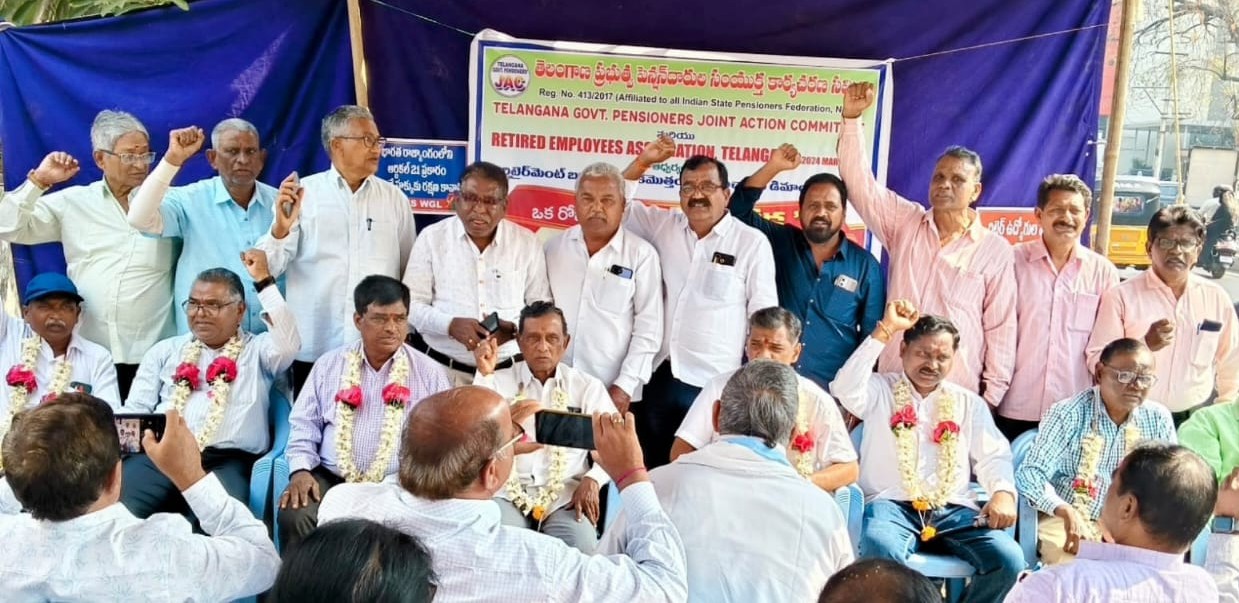 హన్మకొండ, ప్రజాతంత్ర, డిసెంబర్ 24ః రిటైర్డ్ ఉద్యోగుల పెండింగ్ బకాయిలను వెంటనే చెల్లించాలని పెన్షనర్స్ జేఏసీ జిల్లా అధ్యక్షుడు ఈ.నర్సింహారెడ్డి, రిటైర్డ్ ఎంప్లాయీస్ అసోసియేషన్ ఉమ్మడి జిల్లా అధ్యక్షుడు ధర్మేంద్ర డిమాండ్ చేశారు. రాష్ట్ర రిటైర్డ్ ఎంప్లాయీస్ బకాయిల సాధన కమిటీ, రాష్ట్ర ప్రభుత్వ పెన్షన్ దారుల సంయుక్త కార్యాచరణ సమితి ఆధ్వర్యంలో రాష్ట్రవ్యాప్తంగా ఒక రోజు నిరాహార దీక్షలు పిలుపుమేరకు హన్మకొండ ఏకశిలా(జయశంకర్) పార్కు దగ్గర నిరాహార దీక్షలు నిర్వహించారు. ఈ సందర్భంగా వి.రాంమనోహర్, కందుకూరి దేవదాసు, కడారి బోగేశ్వర్, టి.పురుషోత్తం, కె.సుధీర్ బాబులు మాట్లాడుతూ మార్చి 2024 నుండి నవంబర్ 2025 వరకు రిటైర్ అయిన ఉద్యోగ, ఉపాధ్యాయులకు ప్రభుత్వం చెల్లించాల్సిన బకాయిలను 20 నెలలు గడిచినా చెల్లించకపోవడం దారుణమని, ఇది పెన్షనర్లను మానసికంగా వేధించడమేనని, తీవ్ర అనారోగ్యానికి గురి చేయడం ప్రభుత్వానికి సరియైనది కాదని అన్నారు.పెండింగ్ బకాయిలన్నింటినీ వెంటనే చెల్లించాలని డిమాండ్ చేశారు. రాష్ట్రవ్యాప్తంగా ఇప్పటివరకు దాదాపు 35 మంది పెన్షనర్లు బకాయిల గోసతో చనిపోయారన్నారు. దాదాపు 14వేల మందికి 20 నెలల నుండి బకాయిలు చెల్లించలేని కారణంగా విసిగివేసారి కొంతమంది ఆత్మహత్య చేసుకుంటున్నారు. ప్రభుత్వం మానవతా దృక్పథంతో రిటైర్డ్ ఉద్యోగుల కుటుంబాలను కాపాడాలని, వెంటనే పెండింగ్ బకాయిలు అన్నింటిని ఏకమొత్తంలో చెల్లించాలని డిమాండ్ చేశారు. ఎస్జీపీఏటీ వరంగల్ జిల్లా అధ్యక్షుడు టి.వీరయ్య, జి.సాంబయ్య, కె.సమ్మారెడ్డి మాట్లాడుతూ తక్షణం కనీసం పిఆర్సీ 2020 ఎరియర్స్, జిపిఎఫ్ బిల్లులు, లీవ్ ఎన్క్యాష్మెంట్, గ్రాట్యూటీ, కమ్యుటేషన్, సర్వీసులో చేసుకున్న సరెండర్ లీవులు వెంటనే చెల్లించాలని డిమాండ్ చేశారు. నిరాహార దీక్షలో ఎండీ మహబూబుఅలీ, ఇ.ఇంద్ర సేనారెడ్డి, విశ్వనాథం, వేల్పుల రవీందర్, రఘువీర్, పి.రాజిరెడ్డి, పి.సమ్మయ్య, ఎండీ మదార్ సాహెబ్ M.రా జకొమురమ్మ,పి.వి కృష్ణారావు పాల్గొన్నారు. బీజేపీ వరగల్ జిల్లా అధ్యక్షుడు గంట రవికుమార్, హన్మకొండ జిల్లా అధ్యక్షుడు కోల సంతోష్ రెడ్డి, మాజీ అధ్యక్షురాలు రావు పద్మ, టి.పి.టి.ఎఫ్. జిల్లా అధ్యక్షుడు యు. అశోక్, డి.టీఎఫ్ జిల్లా అధ్యక్షుడు ఎ.గోవింద రావులు శిబిరానికి సంఘీభావం ప్రకటించి మాట్లాడారు. కార్యక్రమంలో బకాయిల సాధన కమిటీ ట్రెజరర్ సూర కుమారస్వామి, జాయింట్ సెక్రెటరీలు ఎండి. అబ్దుల్ గఫార్, ఎం.దామోదర్, ఈ. ఇంద్రసేనారెడ్డి,ఎల్.ప్రభాకర్ రెడ్డి, అశోక్ కుమార్,పి.రాజి రెడ్డి, సారయ్య, రాజేందర్, కే.శ్యామ్ రావు, జే. మహేందర్ రావు, ఎం.సంజీవరెడ్డి,మామిండ్ల మురళీ తదితరులు 180 మంది ఈ దీక్షా శిబిరంలో పాల్గొన్నారు.