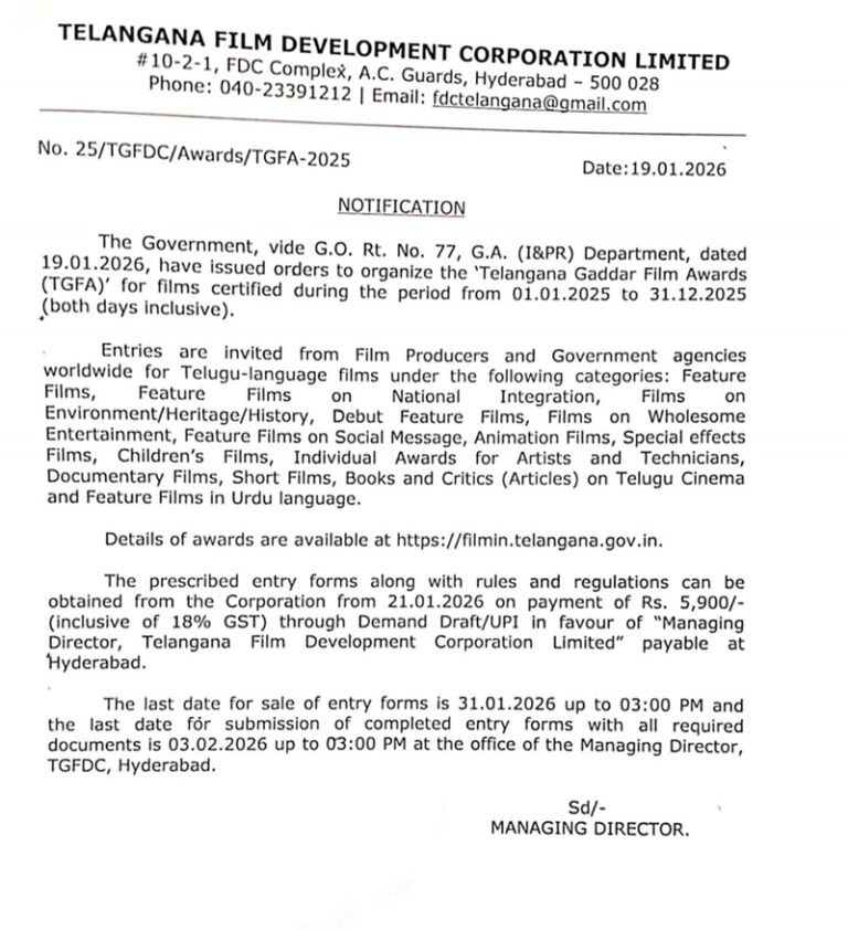 హైదరాబాద్, ప్రజాతంత్ర, జనవరి 22 :సెంట్రల్ బోర్డ్ ఆఫ్ ఫిల్మ్ సర్టిఫికేషన్ (సీబీఎఫ్సీ) ద్వారా 2025 జనవరి 1 నుంచి డిసెంబర్ 31 వరకు సర్టిఫికేషన్ పొందిన చిత్రాలకు తెలంగాణ గద్దర్ ఫిల్మ్ అవార్డ్స్–2025 ప్రదానం చేయనున్నట్లు రాష్ట్ర చలనచిత్ర పరిశ్రమాభివృద్ది సంస్థ తెలిపింది. ఫీచర్ ఫిలిమ్స్, జాతీయ సమైక్యతపై ఫీచర్ ఫిలిమ్స్, పర్యావరణం, హెరిటేజ్,…