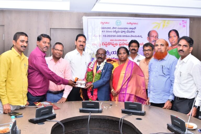 హైదరాబాద్, ప్రజాతంత్ర, అక్టోబర్ 31: సమాచార, పౌర సంబంధాల శాఖలో డిప్యూటీ డైరెక్టర్గా ఉన్న జి.ప్రసాదరావు శుక్రవారం పదవీ విరమణ చేశారు వివిధ హోదాల్లో దాదాపు 41 సంవత్సరాలు పనిచేసిన ఆయన పదవీ విరమణ కార్యక్రమాన్ని సమాచార భవన్లో ఘనంగా నిర్వహించారు. ఖమ్మం, వరంగల్, ఆదిలాబాద్, హైదరాబాద్ జిల్లాల్లో వివిధ హోదాల్లో పని చేసిన అయన…