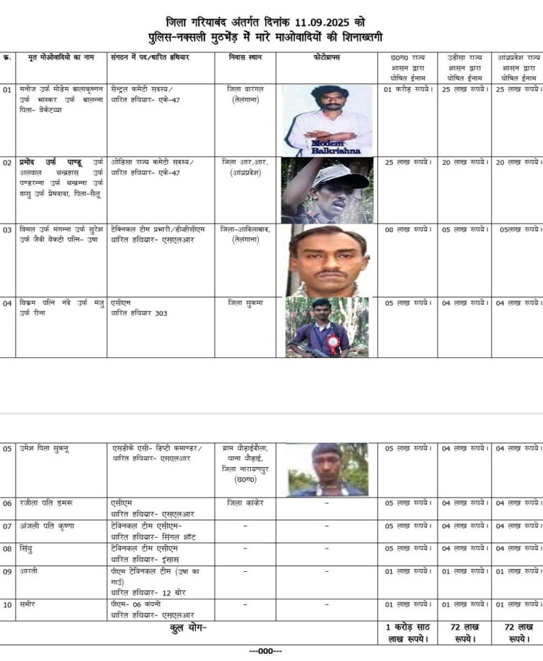భద్రాచలం, ప్రజాతంత్ర, సెప్టెంబర్ 12 : ఛత్తీస్గఢ్ రాష్ట్రంలోని సుక్మా-గరియాబంద్ సరిహద్దు ప్రాంతాల్లో గురువారం మావోయిస్టులకు, భద్రత బలగాలకు మధ్య జరిగిన ఎదురుకాల్పుల్లో మృతిచెందిన పదిమంది నక్సల్స్ ను పోలీసు ఉన్నతాధికారులు శుక్రవారం గుర్తించారు. ఈ నక్సల్స్పై మహరాష్ట్ర, ఛత్తీస్గఢ్, ఒడిశా రాష్ట్రాలు రివార్డులను ప్రకటించాయి. మృ తిచెందినవారిలో కీలక నేతలు మోడెం బాలకృష్ణ అలియాస్…