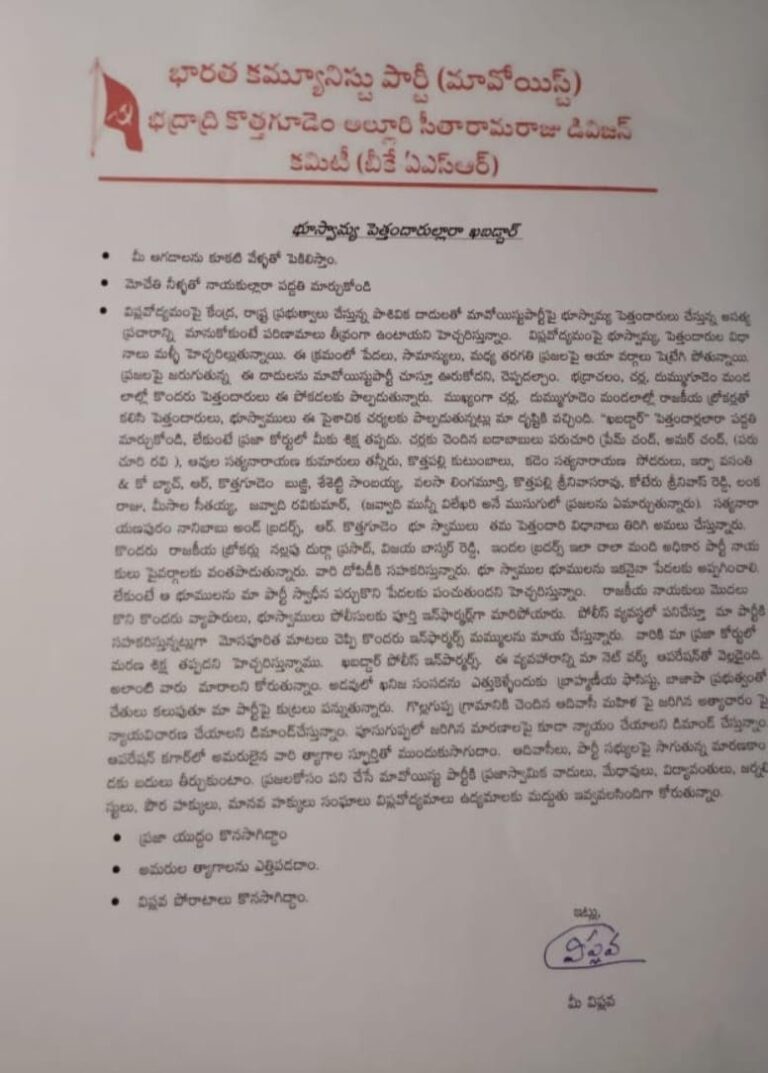 – మావోయిస్టులపై అసత్య ప్రచారం మానుకోవాలి – ప్రజా కోర్టులో శిక్ష తప్పదు – భద్రాద్రి కొత్తగూడెం అల్లూరి సీతారామరాజు జిల్లా కార్యదర్శి భద్రాచలం, ప్రజాతంత్ర, సెప్టెంబర్ 19 : విప్లవోద్యమంపై కేంద్ర, రాష్ట్ర ప్రభుత్వాలు చేస్తున్న పాశవిక దాడులతో మావోయిస్టు పార్టీపై భూస్వామ్య పెత్తందారులు చేస్తున్న అసత్య ప్రచారాన్ని మానుకోకుంటే పరిణామాలు తీవ్రంగా ఉంటాయని…