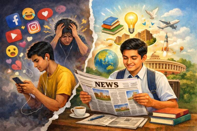 “నేటి డిజిటల్ యుగంలో విద్యార్థులు ఎక్కువగా మొబైల్ ఫోన్లు, సోషల్ మీడియా, షార్ట్ వీడియోలకే పరిమితమవుతున్నారు. దీని వల్ల ఏకాగ్రత లోపించడం, మానసిక ఒత్తిడి (డిజిటల్ డిప్రెషన్) వంటి సమస్యలు పెరుగుతున్నాయి. ఇలాంటి సమయంలో పత్రిక పఠనాన్ని అలవాటుగా మార్చడం ద్వారా విద్యార్థుల్లో ప్రశాంతత, ఆలోచనా శక్తి, భాషా నైపుణ్యాలు మెరుగుపడతాయి. వార్తా పత్రికలు చదవడం…