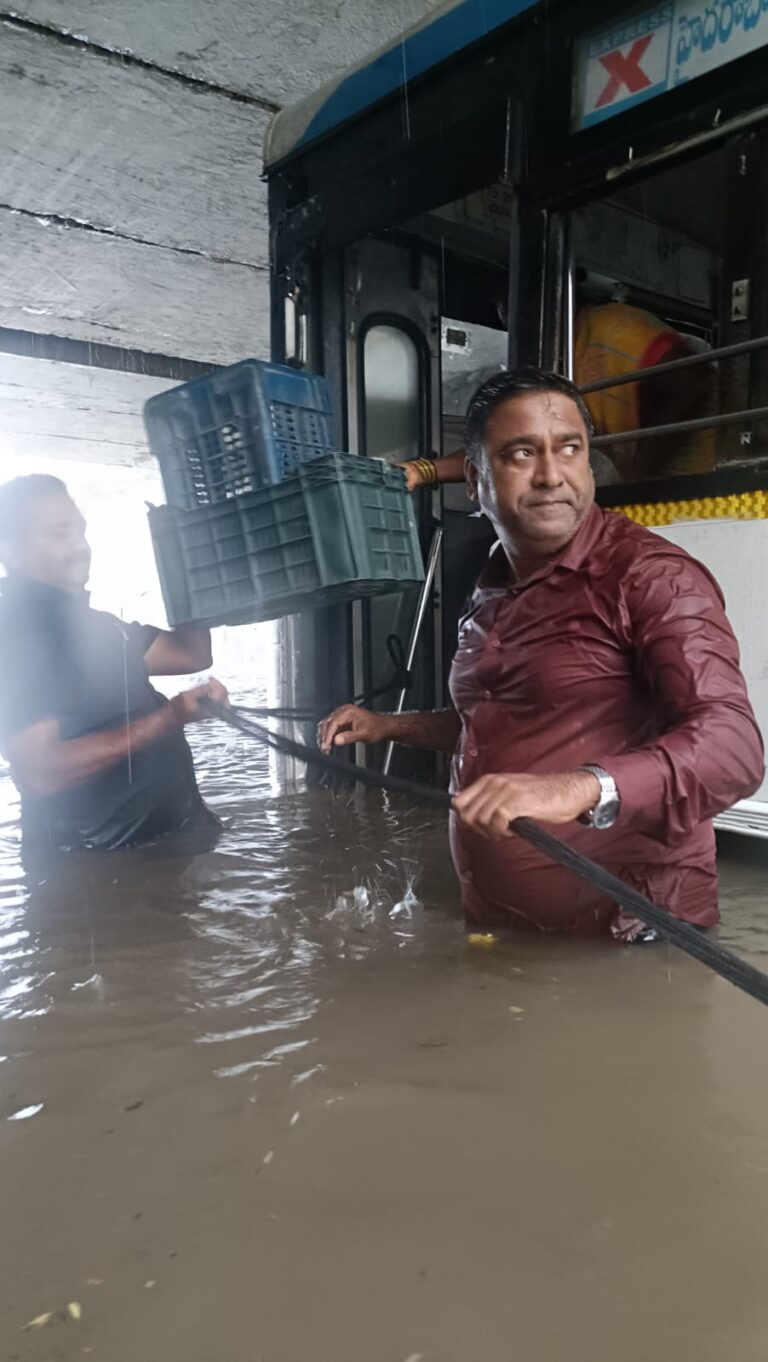 వరద నీటిలో నిలిచిపోయిన బస్సు