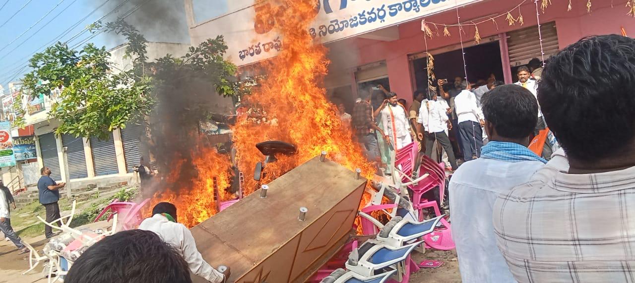 మణుగూరు, ప్రజాతంత్ర, నవంబర్ 02: మణుగూరు మండలంలోని తెలంగాణ భవన్ వద్దా హై టెన్షన్ నెలకొంది. . గత ఎలక్షన్లలో కాంగ్రెస్ పార్టీ నుంచి గెలుపొంది ఎమ్మెల్యే అయిన మాజీ ఎమ్మెల్యే రేగా కాంతారావు కాంగ్రెస్ పార్టీ నుంచి టిఆర్ఎస్ పార్టీలోకి మారి కాంగ్రెస్ పార్టీ కార్యాలయాన్ని తెలంగాణ భవన్ గా మార్చేశారు. పలుమార్లు కాంగ్రెస్ పార్టీ నాయకులు కార్యాలయం కోసం ఆందోళనలు చేసినప్పటికీ ఎటువంటి ఫలితాలు లభించకపోవడంతో ఆదివారం వందల సంఖ్యలో కాంగ్రెస్ పార్టీ నాయకులు కార్యకర్తలు అభిమానులు తెలంగాణ భవన్ వద్దకు చేరుకొని కార్యాలయంలోని ఫర్నిచర్ అంతా బయటపడేసి పెట్రోల్ పోసి తగలబెట్టడంతో పెద్ద మంటలు వ్యాపించాయి.