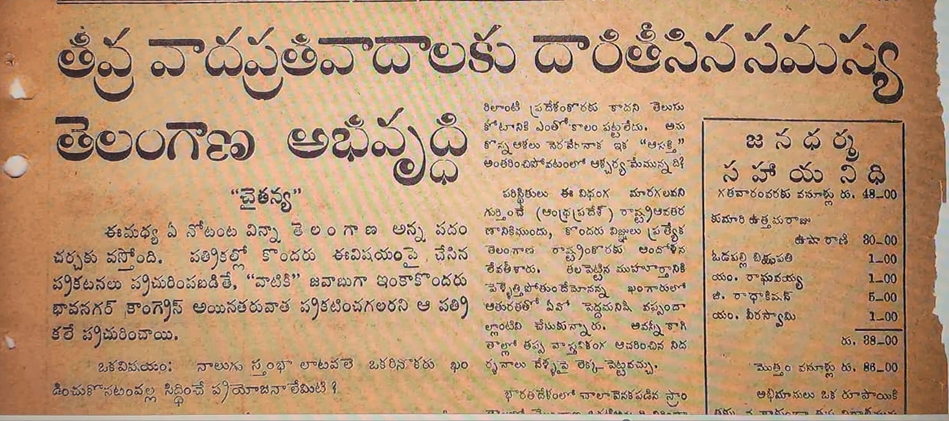తీవ్ర వాద ప్రతివాదాలకు దారితీసిన సమస్య తెలంగాణ అభివృద్ధి అనే శీర్షికతో జనధర్మ ప్రచురించింది. ఈ మధ్య ఏ నోటంట విన్నా తెలంగాణ అన్న పదం చర్చకు వస్తోంది. పత్రికల్లో కొందరు ఈ విషయంపై చేసిన ప్రకటనలు ప్రచురింపబడితే, ‘వాటికి’ జవాబుగా ఇంకా కొందరు భాగ్యనగర్ కాంగ్రెస్ అయిన తరువాత ప్రకటించగలరని ఆ పత్రికేలే ప్రచురించారు. (ఆర్థిక సమస్యల వల్ల మిత్రులైన పాఠకులు జనధర్మ సహాయ నిధి ద్వారా కొంత డబ్బు సేకరించేవారని మొదటి పేజీలో వేసిన సంగతి చూడండి. మొత్తం 48 రూపాయల విరాళాలు వసూళ్లు ఇచ్చారు) ఇది ఒక విషయం: నాలుగ స్తంభాలాటవలె ఒకరినొకరు ఖండిచుకొనటం వల్ల సిద్ధించే ప్రయోజనాలేమిటి?