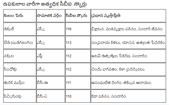 ఈ 42 పారామీటర్ల విశ్లేషణ ద్వారా ఎస్సీ డక్కల్ కులం 116 పాయింట్లతో రాష్ట్రంలోనే అత్యంత వెనుకబడిన కులంగా తేలింది. దీనికి విరుద్ధంగా, ఓసీ కేటగిరీలోని కాపు కులం 12 పాయింట్లతో అత్యల్ప వెనుకబాటుతనాన్ని, అంటే గరిష్ట అభివృద్ధిని నమోదు చేసింది.
