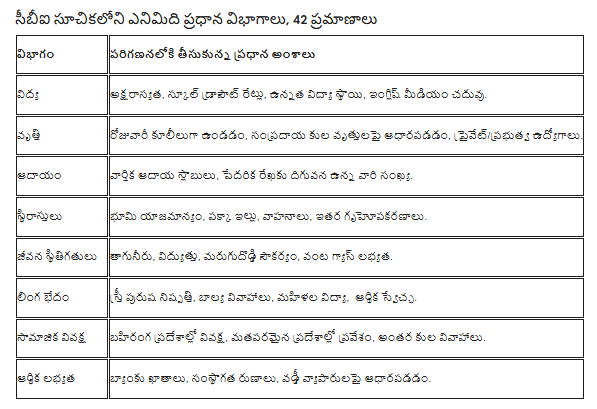తెలంగాణ ప్రభుత్వం ఏర్పాటు చేసిన తొమ్మిది మంది సభ్యుల స్వతంత్ర నిపుణుల బృందం (ఐఈడబ్ల్యూజీ), సుప్రీంకోర్టు మాజీ న్యాయమూర్తి జస్టిస్ సుదర్శన్ రెడ్డి నేతృత్వంలో, వెనుకబాటుతనాన్ని కొలవడానికి “కాంపోజిట్ బ్యాక్వర్డ్నెస్ ఇండెక్స్” (సీబీఐ) అనే కొత్త విధానాన్ని ప్రవేశపెట్టింది. ఇది కేవలం ఆర్థిక స్థితిని మాత్రమే కాకుండా, సామాజిక గౌరవం, విద్యా అవకాశాలు, రాజకీయ ప్రాతినిధ్యం, భౌగోళిక పరిస్థితులను పరిగణనలోకి తీసుకునే బహుమితీయ సూచిక. ఈ సూచికను రూపొందించడానికి 42 విభిన్న పారామీటర్లను (ప్రమాణాలను) ఎనిమిది ప్రధాన వర్గాల కింద వర్గీకరించారు. ఈ ప్రమాణాల ఆధారంగా ప్రతి కులానికి 0 నుంచి 126 మధ్య స్కోరు కేటాయించబడింది. స్కోరు ఎంత ఎక్కువగా ఉంటే ఆ కులం అంత ఎక్కువగా వెనుకబడి ఉందని అర్థం. రాష్ట్ర సగటు సీబీఐ స్కోరు 81గా నిర్ణయించబడింది. ఈ సగటు కంటే ఎక్కువ స్కోరు సాధించిన కులాలు రాష్ట్రంలోని సగటు పౌరుడి కంటే వెనుకబడి ఉన్నట్టు పరిగణించబడతాయి.