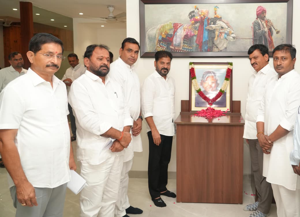 హైదరాబాద్, ప్రజాతంత్ర, అక్టోబర్ 15: మాజీ రాష్ట్రపతి, భారత రత్న అబ్దుల్ కలాంకు ముఖ్యమంత్రి ఎ.రేవంత్రెడ్డి బుధవారం ఘనంగా నివాళులర్పించారు. ఆయన జయంతి సందర్భంగా జూబ్లీహిల్స్లోని నివాసంలో ఆ మహనీయుడి చిత్రపటానికి పూలమాలలు వేసి శాస్త్రవేత్తగా, రాష్ట్రపతిగా ఆయన చేసిన సేవలను కొనియాడారు. ఈ కార్యక్రమంలో రెవెన్యూ శాఖ మంత్రి పొంగులేటి శ్రీనివాసరెడ్డి, సీఎం సలహాదారు వేం నరేందర్ రెడ్డి, ఎంపీలు రఘువీర్ రెడ్డి, చామల కిరణ్ కుమార్ రెడ్డి ఎంఎల్ఏ రాందాస్ నాయక్లు పాల్గొని అబ్దుల్ కలాంకు నివాళులర్పించారు.