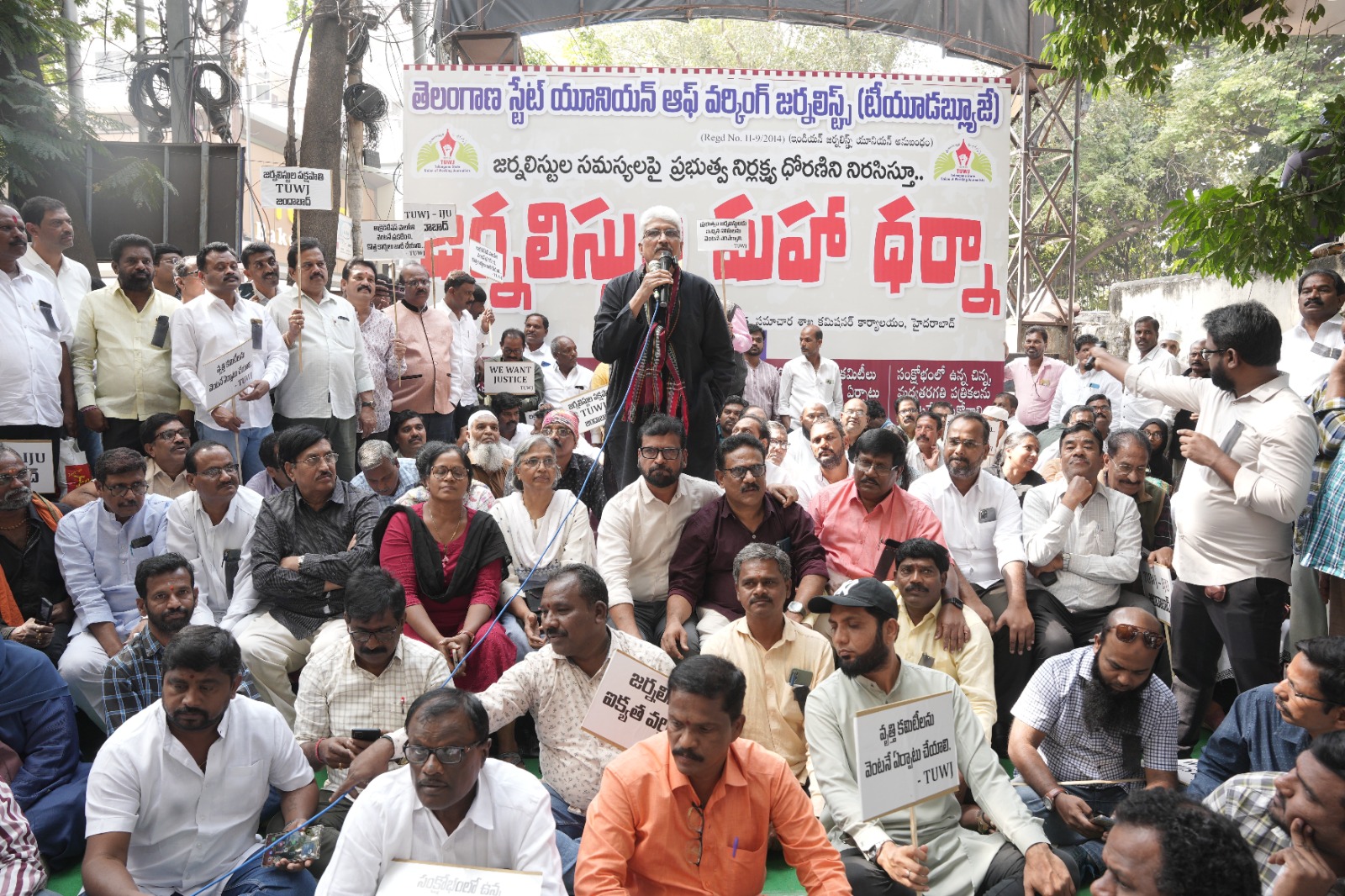 హైదరాబాద్, ప్రజాతంత్ర, డిసెంబర్ 3 : పన్నెండేండ్లుగా నిర్లక్ష్యానికి గురవుతున్న జర్నలిస్టుల సమస్యలను వెంటనే పరిష్కరించాలని డిమాండ్ చేస్తూ మాసాబ్ ట్యాంక్లోని సమాచార కమిషనర్ కార్యాలయం ప్రాంగణంలో తెలంగాణ రాష్ట్ర వర్కింగ్ జర్నలిస్టుల సంఘం(టీయూడబ్ల్యూజే) ఆధ్వర్యంలో బుధవారం నిర్వహించిన మహా ధర్నా విజయవంతం అయింది. టీయూడబ్ల్యూజే పిలుపుపై స్పందించి రాజధాని హైదరాబాద్తోపాటు రాష్ట్రం నలుమూలల నుండి జర్నలిస్టులు భారీగా తరలి రావడం విశేషం. జర్నలిస్టుల నినాదాలతో మహానగరం దద్దరిల్లింది. సమాచార శాఖ చరిత్రలో ఆ కార్యాలయం వద్ద ఇంత పెద్ద సంఖ్యలో జర్నలిస్టులు ధర్నా చేయడం ప్రప్రథమని పోలీసు అధికారులు సహా పలువురు సీనియర్ పాత్రికేయులు చర్చించుకోవడం విశేషం. ధర్నాకు యూనియన్ అనుబంధ సంస్థలైన తెలంగాణ ఫోటో జర్నలిస్ట్స్ అసోసియేషన్, తెలంగాణ వీడియో జర్నలిస్ట్స్ అసోసియేషన్, తెలంగాణ చిన్న, మద్య తరగతి పత్రికల సంఘం, మహిళా జర్నలిస్టుల విభాగం, తెలంగాణ ఉర్దూ జర్నలిస్టుల సమాఖ్యలతోపాటు హైదరాబాద్ ప్రెస్ క్లబ్, జూబ్లీహిల్స్ హౌసింగ్ సొసైటీ, జవహర్లాల్ హౌసింగ్ సొసైటీ, టీజేఏలు సంపూర్ణ మద్దతును ప్రకటించి మహా ధర్నాలో భాగస్వామ్యం అయ్యాయి. టీయూడబ్ల్యూజే రాష్ట్ర అధ్యక్షుడు కె.విరాహత్ అలీ అధ్యక్షతన జరిగిన ఈ మహా ధర్నాలో ఇండియన్ జర్నలిస్ట్స్ యూనియన్(ఐజేయూ) స్టీరింగ్ కమిటీ సభ్యులు దేవులపల్లి అమర్, ఎం.ఎ.మాజీద్, జాతీయ కార్యదర్శి వై.నరేందర్ రెడ్డి, యూనియన్ రాష్ట్ర ప్రధాన కార్యదర్శి కె.రాంనారాయణ, ఉప ప్రధాన కార్యదర్శి కలుకూరి రాములు ఐజేయు జాతీయ కార్యవర్గ సభ్యులు కె.సత్యనారాయణ, నగునూరి శేఖర్, చిన్న పత్రికల సంఘం అధ్యక్ష, ప్రధాన కార్యదర్శులు యూసుఫ్ బాబు, అశోక్, హైదరాబాద్ ప్రెస్ క్లబ్ అధ్యక్ష, ప్రధాన కార్యదర్శులు విజయ్ కుమార్ రెడ్డి, రమేష్, ఫోటో జర్నలిస్ట్స్ అసోసియేషన్ అధ్యక్ష, ప్రధాన కార్యదర్శులు గంగాధర్, కె.ఎన్.హరి, వీడియో జర్నలిస్టుల సంఘం అధ్యక్ష, ప్రధాన కార్యదర్శులు నాగరాజు, హరీష్, జూబ్లీహిల్స్ హౌసింగ్ సొసైటీ అధ్యక్షుడు గోపరాజు, హెచ్యూజే అధ్యక్షుడు శిగా శంకర్ గౌడ్, హైదరాబాద్ ప్రెస్క్లబ్ ఉపాధ్యక్షుడు ఎ.రాజేష్, ఉర్దూ జర్నలిస్ట్స్ అసోసియేషన్ ప్రధాన కార్యదర్శి గౌస్, సీనియర్ మహిళా జర్నలిస్టులు విమల, అత్తలూరి అరుణ, వాకటి మంజుల, కళ్యాణం రాజేశ్వరి తదితరులు మాట్లాడారు.