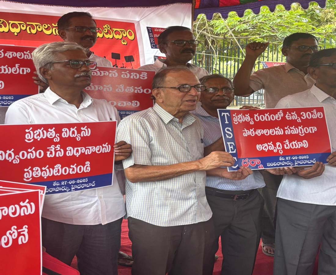 హైదరాబాద్, ప్రజాతంత్ర, జూన్ 27: రాష్ట్రంలో ప్రభుత్వ విద్యను నిర్వీర్యం చేసిన బీఆర్ఎస్ ప్రభుత్వంపై పెల్లుబికిన ఆగహ్రంతో అధికారింలోకి వచ్చిన కాంగ్రెస్ పార్టీ కూడా అవే విధానాలను కొనసాగిస్తోందని తెలంగాణ విద్యా పరిరక్షణ కమిటీ ఆరోపించింది. ప్రభుత్వ విద్యను విధ్వంసం చేసే విధానాలను ప్రతిఘటించాలని పిలుపునిస్తూ తెలంగాణ విద్యా పరిరక్షణ కమిటీ ఇందిరా పార్కువద్ద శుక్రవారం ధర్నా నిర్వహించారు. ఈ సందర్భÛంగా పలు ఉపాధ్యాయ సంఘాల నాయకులు మాట్లాడుతూ కేంద్ర, రాష్ట్ర ప్రభుత్వాలు ప్రభుత్వ విద్యను ధ్వంసం చేసి ప్రైవేటు, కార్పొరేట్ విద్యను ప్రోత్సహిస్తున్నాయని, కార్పొరేటీకరణ, కాషాయీకరణను వేగవంతం చేయడానికి నరేంద్రమోదీ ఆధ్వర్యంలోని బీజేపీ (కేంద్ర) ప్రభుత్వం జాతీయ విద్యా విధానాన్ని తెచ్చిందని, 2014 బడ్జెట్లో బడ్జెట్లో 6 శాతం నిధులు కేటాయిస్తే 2025లో 2.5 శాతానికి తగ్గించిందని కమిటీ ఆరోపించారు. విద్యార్థుల సంఖ్యను పెంచేందుకు చేపట్టిన బడిబాట ఆశించిన ఫలితాలను ఇవ్వడంలేదన్నారు. రాష్ట్రంలో ఎన్నికలపుడు తన మేనిఫెస్టోలో విద్యారంగానికి 15 శాతం నిధులు కేటాయిస్తామని చెప్పిన కాంగ్రెస్ పార్టీ అధికారంలోకి వచ్చిన రెండేళ్లలో కేటాయించిన బడ్జెట్ 7.6 శాతానికి మించలేదని తెలిపారు. పాఠశాలల్లో బోధన సరిగా జరుగుతున్నదా లేదా చూసుకోవడానికి కావలసిన విద్యా శాఖధికారుల పోస్టులు ఖాళీగా ఉన్నాయని , పాఠ్యప్రణాళిక, పాఠ్యాంశాలను ఖరారు చేయాల్సి ఎస్సీఈఆర్టీలోనూ పోస్టులు భారీగా ఖాళీగా ఉన్నాయని, దీంతో ప్రభుత్వ పాఠశాలల్లో నాణ్యమైన విద్య లభిస్తుందనే విశ్వాసం తల్లిదండ్రుల్లో పోయిందని ఆవేదన వ్యక్తం చేశారు. అలాగే యంగ్ ఇండియా ఇంటర్నేషనల్ స్కూల్స్ ఏర్పాటు చేస్తున్నామంటూ కాంగ్రెస్ ప్రభుత్వం ప్రభుత్వ పాఠశాలలను నిర్లక్ష్యం చేస్తోందన్నారు. కార్పొరేటీకరణ, కేంద్రీకరణను, కాషాయీకరణను ప్రోత్సహించే జాతీయ విద్యావిధానాన్ని రాష్ట్ర ప్రభుత్వం తిరస్కరించాలని, పాఠశాల విద్యా వ్యవస్థను ధ్వంసం చేసే 5_3+3+4 విధానాన్ని ప్రవేశపెట్టే ఆలోచనను మానుకోవాలని, కేంద్రం తన బడ్జెట్లో 10 శాతం, రాష్ట్ర బడ్జెట్లో 20 శాతం నిధులు విద్యకు కేటాయించాలని, విదేశీ విశ్వవిద్యాలయాలకు అనుమతులు ఇవ్వరాదని, నియోజకవర్గానికొక ఇంటర్నేషనల్ స్కూల్ ప్రతిపాదనను ఉపసంహరించుకోవాలని, విద్యార్థుల సంఖ్య 20లోపు ఉంటే ఇద్దరు టీచర్లను , ఆ తర్వాత ప్రతి 20మందికి ఒక టీచర్ను నియమించాలని, విద్యార్థుల సంఖ్య 100 దాటితే ఒక ప్రధానోపాధ్యాయుడిని నియమించాలని డిమాండ్ చేశారు. గ్రామీణ ప్రాంతాలను దగ్గరగా ఉన్న రెసిడెన్షియల్ స్కూల్స్ను ఇంటిగ్రేటెడ్ రెసిడెన్షియల్ స్కూళ్ల పేరుమీద పట్టణాలకు తరలించే ప్రక్రియను ఆపివేయాలని, ఆ పాఠశాలలు ఉ