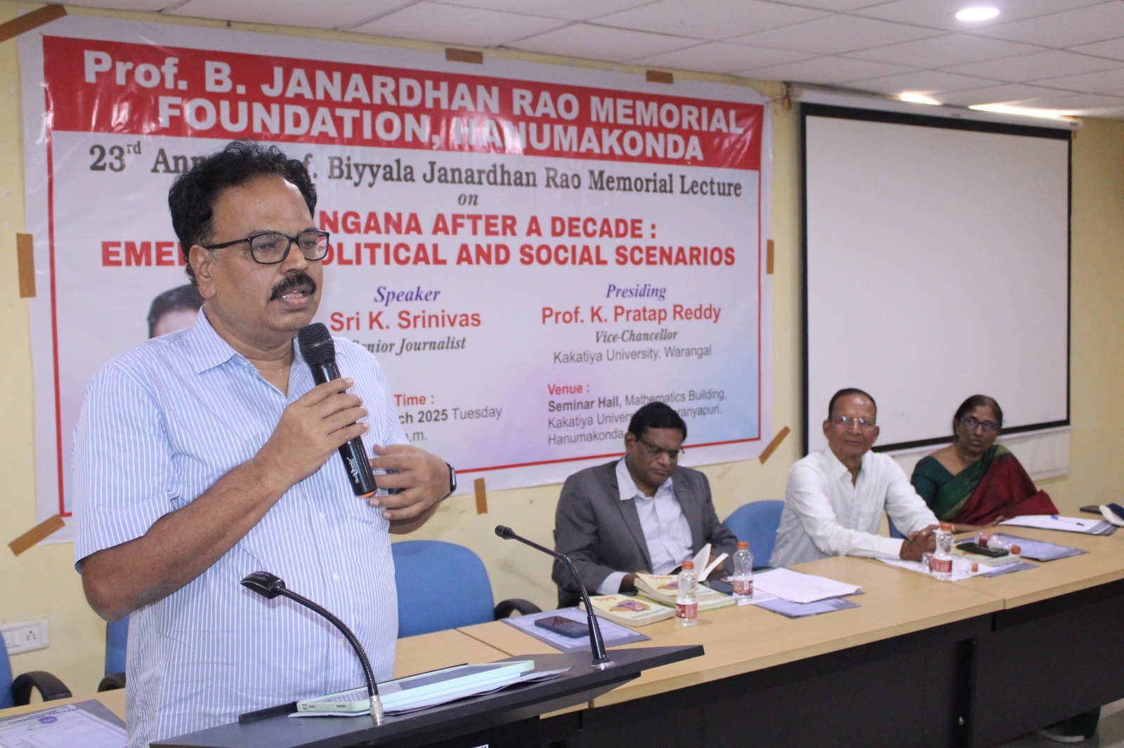 కాళోజీ జంక్షన్/హన్మకొండ ప్రజాతంత్ర, మార్చి 4 : “భవిష్యత్ తెలంగాణ కు ఒక రాజకీయ విలువల తో కూడిన విధాన చట్రం కావాలని ప్రముఖ సీనియర్ జర్నలిస్ట్ డాక్టర్ కే శ్రీనివాస్ అన్నారు. మంగళవారం విశ్వవిద్యాలయ గణిత శాస్త్ర విభాగం సెమినార్ హాల్ లో వైస్ ఛాన్సలర్ ఆచార్య కే. ప్రతాప్ రెడ్డి అధ్యక్షతన నిర్వహించిన “ఆచార్య బి. జనార్దన్ రావు 23 వ వార్షిక స్మారక ఉపన్యాస కార్యక్రమం లో ప్రధాన వక్తగా “తెలంగాణ ఆఫ్టర్ ఏ డికేడ్ ఎమర్జింగ్ పొలిటికల్ అండ్ సోషల్ సినారియోసిస్” అనే అంశం పై అధ్యాపకులు, ఉద్యోగులు, పరిశోధకులు, విద్యార్థులు,విశ్రాంత ఉద్యోగులను ఉద్దేశించి ప్రసంగించారు. గొప్ప తాత్త్విక సిద్ధాంతకర్త ఆచార్య బి. జనార్ధన్ రావు అని గుర్తు చేశారు. అయన సమగ్ర అభివృద్ధి తో కూడుకొని ఉహించిన తెలంగాణా రూపకల్పన చేసారన్నారు. అయన ఆలోచనకు అనుగుణంగా జరుగలేదు అన్నారు. తెలంగాణా రాష్ట్ర డైనమిక్స్ మారుతున్నయన్నారు. మూడవ వర్గం ఏమర్జ్ అవుతుంది అన్నారు. తెలంగాణా గ్రామాలు డ్రగ్స్, ఆన్లైన్ బెట్టింగ్, లోన్ యాప్ లు వ్యసనాల బారిన పడిందన్నారు. పని చేయటానికి విముఖత తో ఇతర రాష్ట్ర కార్మికులు వలస వొస్తున్నారన్నారు. దీని నివారణ కు సాంస్కృతిక ఉద్యమం జరగాలి అన్నారు. ఉపాధి – అవకాశాల మధ్య అగాధం పెరిగింది అన్నారు. చిరు వ్యాపారుల లో ఉత్తరాది వారి ప్రాభల్యం పెరిగిందని ఆందోళన వ్యక్తం చేశారు. దీని నివారణ కు జోక్యం భద్రత అవసరం ఉందన్నారు. ప్రభుత్వాలు ఆ దిశగా ఆలోచించాలన్నారు. గ్రామీణ దుస్థితి ఉపశమనం పొందే దిశగా సంక్షేమ పధకాలు ఉండాలన్నారు. వ్యవసాయ సంబంధిత భూమి ఇతర రంగాలకు మరులుతుంది అన్నారు. రియల్ ఎస్టేట్ పెరిగిందని ఆవేదన వ్యక్తం చేశారు. ఆహార భద్రత అంటే కేవలం వరి లభ్యత ఒక్కటే కాదన్నారు. 10 సంవత్సరాలు లో 7000 మంది రైతులు ఆత్మ హత్య చేసుకున్నారని వెల్లడించారు. విద్య, వైద్యం నిర్లక్ష్యం కాబడ్డాయని పేర్కొన్నారు. పాలకులలో జవాబు దారి తనం పెరగాలనీ ..10 సంవత్సరాలలో నైతికత లేకుండా పోయిందన్నారు. సివిల్ సొసైటీ లో చైతన్యం తగ్గిందన్నారు. దేశ రాజకీయలకు భిన్నంగా తెలంగాణా కొనసాగుతుందన్నారు. హింస పెరిగిందని స్పష్టం చేశారు. అందరి బాగుకోసం, భవిష్యత్ తెలంగాణా కోసం తెలంగాణా ఉద్యమ సమాజం పునర్ ఆలోచించాలన్నారు. ఈ కార్యక్రమం లో బియ్యాల జనార్ధన రావు మెమోరియల్ ఫౌండేషన్ బాధ్యులు ఆచార్య ఈ.రేవతి, ఆచార్య కే. మురళి మనోహర్, ఆచార్య నరేంద్ర బాబు తో పాటు బుచ్చి బాబు తదితరులు పాల్గొన్నారు.