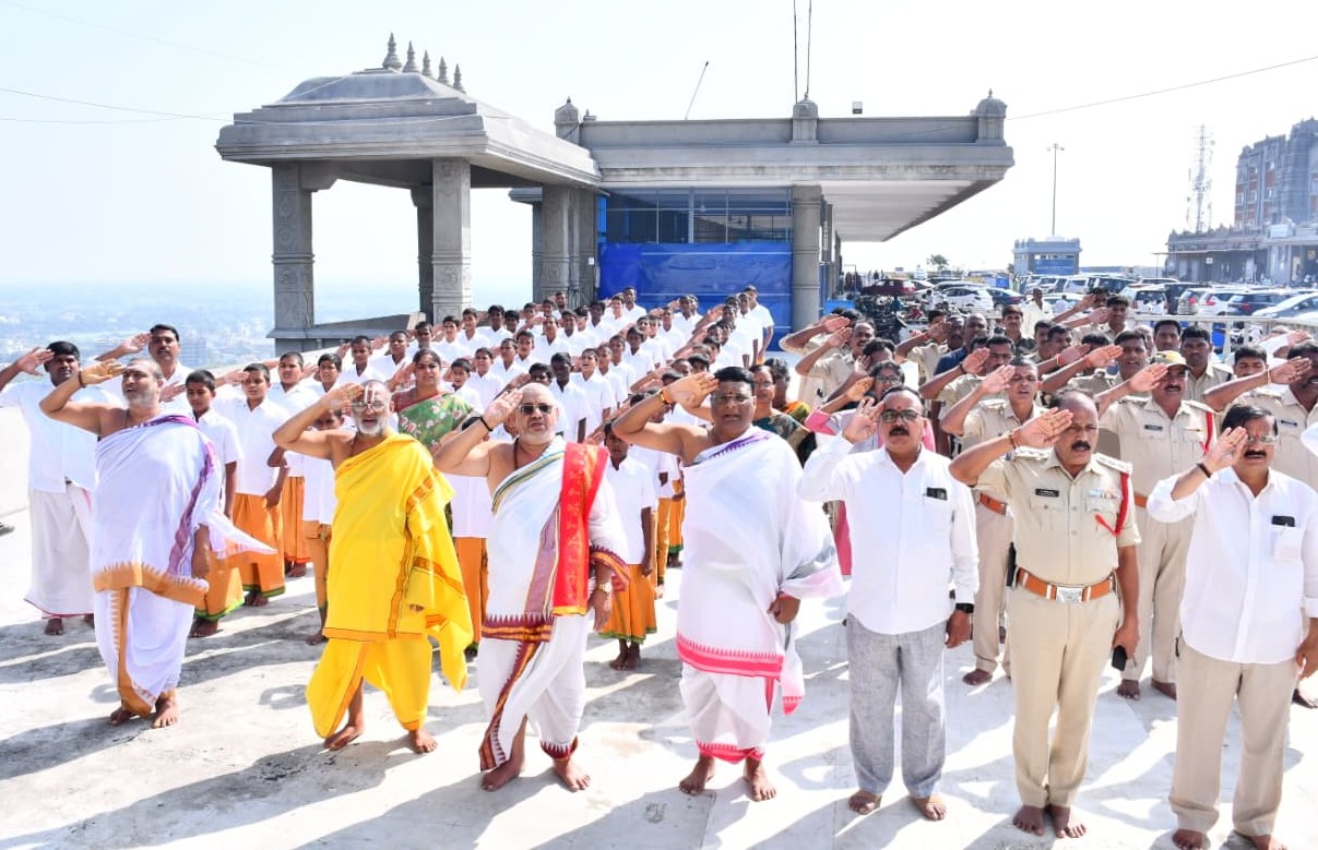 యాదగిరిగుట్ట, ప్రజాతంత్ర, నవంబర్ 7: ప్రముఖ పుణ్యక్షేత్రమైన యాదగిరిగుట్ట శ్రీ లక్ష్మీనరసింహస్వామి ఆలయ కార్యాలయం ముందు ఆలయ అధికారులు వందేమాతర గీతాన్ని శుక్రవారం ఆలపించారు. దేశ జాతీయ గేయం వందేమాతరం రచించి 150 సంవత్సరాలు పూర్తి అయిన సందర్భంగా కేంద్ర ప్రభుత్వ ఆదేశాల మేరకు దేశవ్యాప్తంగా ప్రభుత్వ కార్యాలయాల ముందు వందేమాతర గీతం ఆలాపన కార్యక్రమాన్ని నిర్వహించారు. ఈ సందర్భంగా ఉదయం 10 గంటలకు యాదగిరిగుట్ట ఆలయ అధికారులు, సిబ్బంది, అర్చకులు, ఎస్పీఎఫ్ భద్రతా సిబ్బంది, సంస్కృత పాఠశాల విద్యార్థులు వందేమాతరం గీతాన్ని ఆలయ కార్యాలయం ముందు ఆలపించారు. ఈ కార్యక్రమంలో ఆలయ ప్రధాన అర్చకుడు సురేంద్రచారి,తిర అర్చకులు, ఈవో దయాకర్ రెడ్డి, ఏఈవోలు గజవల్లి రఘు, నవీన్, జె.కృష్ణ, మహేష్, ఎస్పీఎఫ్ సి.ఐ. శేషగిరిరావు, సిబ్బంది, సంస్కృత పాఠశాల విద్యార్థులు, భక్తులు పెద్ద సంఖ్యలో పాల్గొన్నారు.