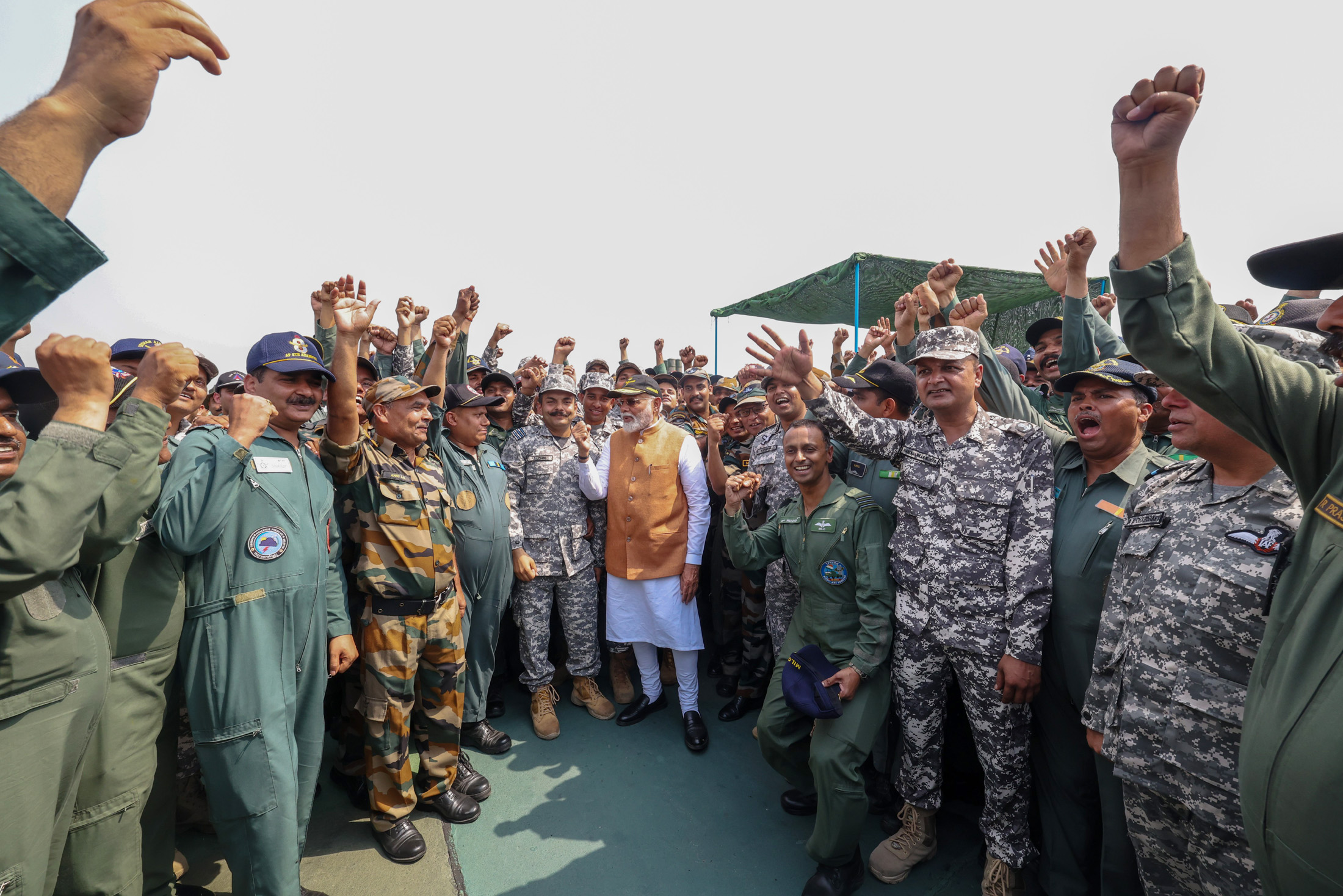 భారత్ చూపిన ఈ పరాక్రమం.. త్రివిధ దళాల త్రివేణీ సంగమమన్నారు. పాకిస్థాన్కు భారత వాయుసేన తన సత్తా చాటిందంటూ ప్రశంసల జల్లు కురిపించారు. యుద్ధ క్షేత్రంలోనూ భారత్ మాతాకీ జై నినాదాలు చేశామని.. ఈ జయ జయ ద్వానాలు ప్రపంచమంతా విన్నదని ఆయన గుర్తు చేశారు. భారత్ మాతాకీ జై అనేది ప్రతీ పౌరుడి నినాదమని ప్రధాని మోదీ ఈ సందర్భంగా పేర్కొన్నారు. అణు బాంబు హెచ్చరికలను సైతం చిత్తు చేశామని చెప్పారు. దేశంలోని ప్రతీ పౌరుడూ గర్వపడేలా రు చేశారంటూ సైనికులను ఈ సందర్భంగా ప్రధాని మోదీ అభినందించారు. రందరూ చరిత్ర సృష్టించారంటూ సైనికులను వెన్నుతట్టి ప్రోత్సహించారు. కోసమే నేను ఇక్కడికి వచ్చానని చెప్పారు. వీరులను చూసినప్పుడు జీవితం ధన్యమవుతోందని ప్రధాని మోదీ పేర్కొన్నారు.’భారత్ మాతాకీ జై’ నినాదం శత్రువుల చెవుల్లో గింగిరాలు తిరుగుతోందని ప్రధాని మోదీ అన్నారు. అది శత్రువుల వెన్నులో వణుకు పుట్టించిందని వ్యాఖ్యానించారు.