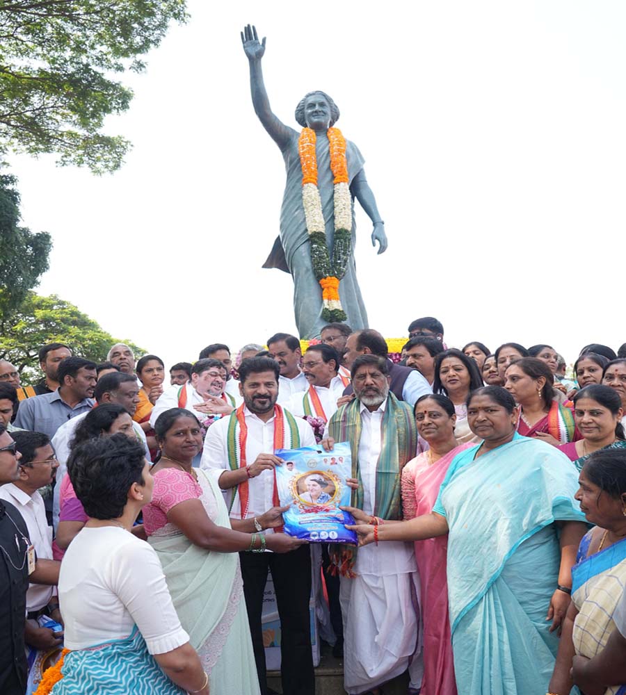 ఇందిరమ్మ చీరల పంపిణీ కార్యక్రమం అట్టహాసంగా జరిగింది. ముఖ్యమంత్రి రేవంత్ రెడ్డి చేతుల మీదుగా మహిళా స్వయం సహాయక సంఘాల సభ్యులకు చీరలు అందజేశారు. తొలుత పంచాయతీరాజ్ గ్రామీణాభివృద్ది శాఖ మంత్రి దనసరి అనసూయ సీతక్క, ఇతర మంత్రులతో కలిసి నెక్లెస్ రోడ్ వద్ద ఉన్న ఇందిరా గాంధీ విగ్రహానికి పుష్పాంజలి ఘటించి ఆమె సేవలను స్మరించుకున్నారు. ఈ సందర్భంగా ప్రజలనుద్దేశించి మంత్రి సీతక్క మాట్లాడుతూ దేశ తొలి మహిళా ప్రధానిగా పేదల జీవితాల్లో వెలుగులు నింపిన ఉక్కు మహిళ ఇందిరా గాంధీ జయంతి సందర్భంగా ప్రభుత్వం తరఫున వినమ్ర నివాళులర్పిస్తున్నామన్నారు. పేదరిక నిర్మూలన, సామాజిక న్యాయం, మహిళా సాధికారత కోసం ఇందిరమ్మ చేసిన కృషిని గుర్తు చేస్తూ ఆమె దేశ ఐక్యత కోసం తన ప్రాణాలను అర్పించిన త్యాగశీలి అని కొనియాడారు. ఇందిరమ్మ ఉక్కు సంకల్పం ప్రతి మహిళలో ఉండాలని ఆమె ఆకాంక్షించారు. పంచాయతీరాజ్, గ్రామీణాభివృద్ధి వ్యవస్థలో భాగంగా కాంగ్రెస్ ప్రభుత్వాలు గ్రామీణ పేదరికాన్ని తగ్గించే లక్ష్యంతో మహిళా సంఘాలను స్థాపించాయని, అదే దిశలో రేవంత్రెడ్డి నేతృత్వంలోని ప్రభుత్వం కోటిమంది మహిళలను మహిళా సంఘాల్లో చేర్చి వారిని కోటీశ్వరులను చేయాలనే మహత్తర లక్ష్యంతో ముందుకు సాగుతోందని తెలిపారు. ఈ లక్ష్యానికి ఆరంభంగా కోటిమంది మహిళలకు చీరల పంపిణీ కార్యక్రమాన్ని ప్రారంభించిందని చెప్పారు. మహిళల ఐక్యతను ప్రతిబింబించేలా యూనిఫామ్ చీరలను అందజేయడం సొంత గౌరవాన్ని, సంఘ బలాన్ని సూచిస్తుందన్నారు. ఈ యూనిఫామ్ చీరలతో సెల్ఫ్హెల్ప్ గ్రూప్(ఎస్హెచ్జీ) ఆర్మీ గ్రామీణ ప్రాంతాల్లోని ఆర్థిక సామాజిక సమస్యలపై సమరశంఖం పూరించడానికి సిద్ధమవుతోందన్నారు. తమ ప్రభుత్వం మహిళా సంఘాలకు ఇప్పటివరకు రూ.27 వేల కోట్లకు పైగా వడ్డీ లేని రుణాలు మంజూరు చేసినట్లు చెప్పారు. బ్యాంకులకు మహిళలు 99.99 శాతం రుణాలను సమయానికి చెల్లించడం వారి క్రమశిక్షణకు నిదర్శనమని ఆమె అన్నారు. ప్రభుత్వ సంకల్పానికి మహిళలందరూ తోడ్పాటునందించాలని పిలుపునిచ్చారు.