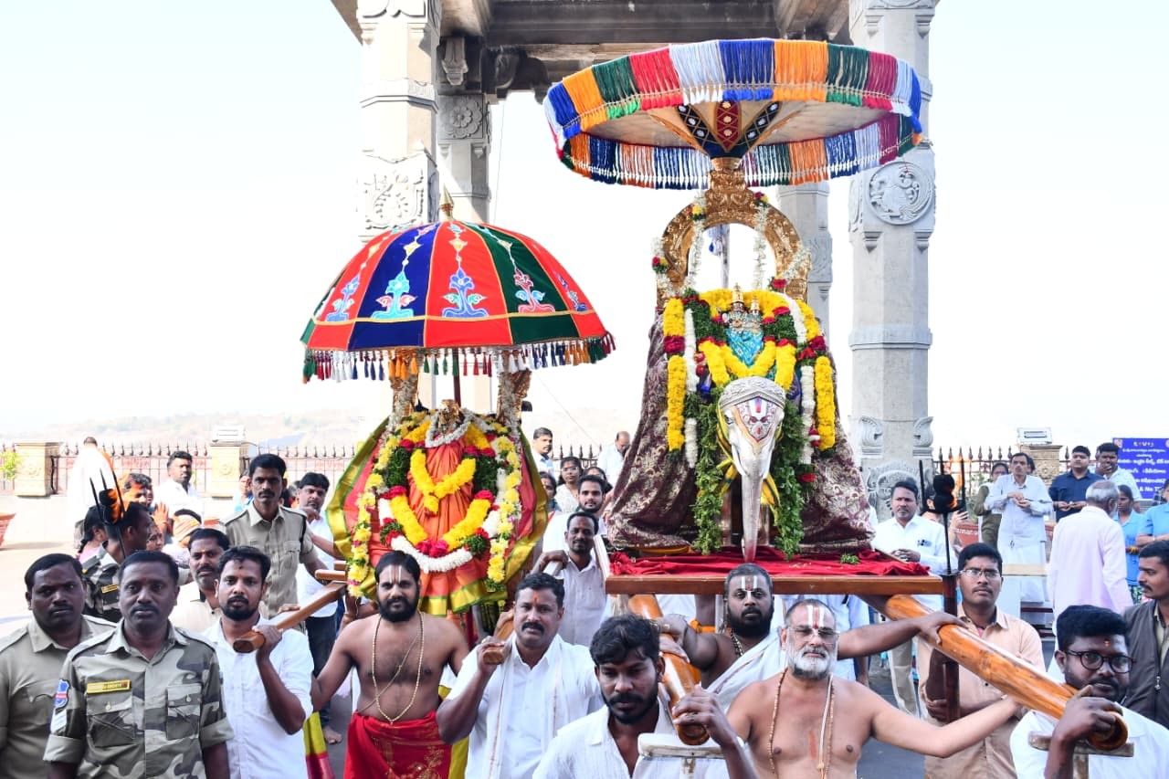యాదగిరిగుట్ట, ప్రజాతంత్ర, జనవరి 13: ప్రముఖ పుణ్యక్షేత్రం యాదగిరిగుట్ట శ్రీ లక్ష్మీనరసింహస్వామి వారి ఆలయంలో కొనసాగుతున్న ధనుర్మాస వ్రత మహోత్సవాల్లో భాగంగా ఐదవ రోజు గోదా అమ్మవారి నీరాట్టోత్సవలు ఆలయంలో అంగరంగ వైభవంగా కొనసాగుతున్నాయి. ఈ ఉత్సవాలలో భాగంగా మంగళవారం ఆలయ అర్చకులు గోదా అమ్మవారికి పంచామృతాలతో నవ కలశ సన్నపనం నిర్వహించారు తదుపరి లక్ష్మి నరసింహ స్వామి గోదా అమ్మవారి సేవలను తిరు మాడవీధులలో ఊరేగింపు చేశారు.మధ్యాహ్నం తిరుప్పావై మంటపములో తిరువారాధన ఆరగింపు చేసి తీర్థప్రసాదాలను అందజేశారు .ఈ ఉత్సవాలలో ఆలయ అధికారులు ఆలయ అర్చకులు సిబ్బంది స్థానికులు భక్తులు అధిక సంఖ్యలో పాల్గొన్నారు.